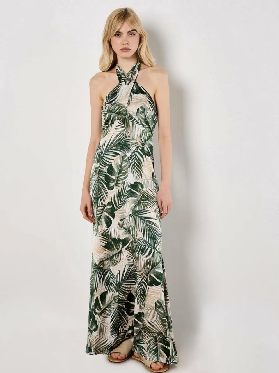 Machen Sie sich bereit für Ihr nächstes Event in diesem weichen, eleganten Satinkleid. Es ist mit einem tropischen Blattmuster bedruckt, das perfekt für die wärmeren Monate ist, und fällt in einer schmeichelhaften, schmalen Passform bis zu einer Maxilänge. Es ist mit einem Wickelmieder und einem im Nacken zu bindenden Neckholder ausgestattet.