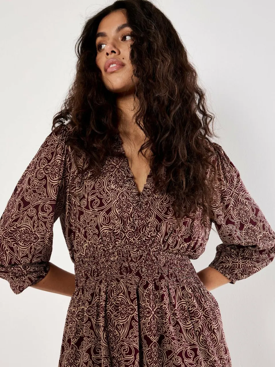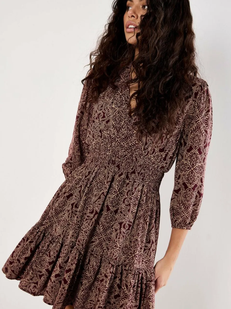 Bringen Sie mit diesem vom Art-Déco-Stil inspirierten Minikleid zeitlose Muster in Ihre Garderobe. Es ist aus einem ultraweichen Stoff gefertigt und für hohen Tragekomfort gefüttert. Mit seinen ¾ langen Ballonärmeln, dem V-Ausschnitt mit Rüschen und der gesmokten Empire-Taille sorgt es für einen femininen Auftritt. Der gestufte Saum verleiht dem Kleid eine verspielte Bewegung.