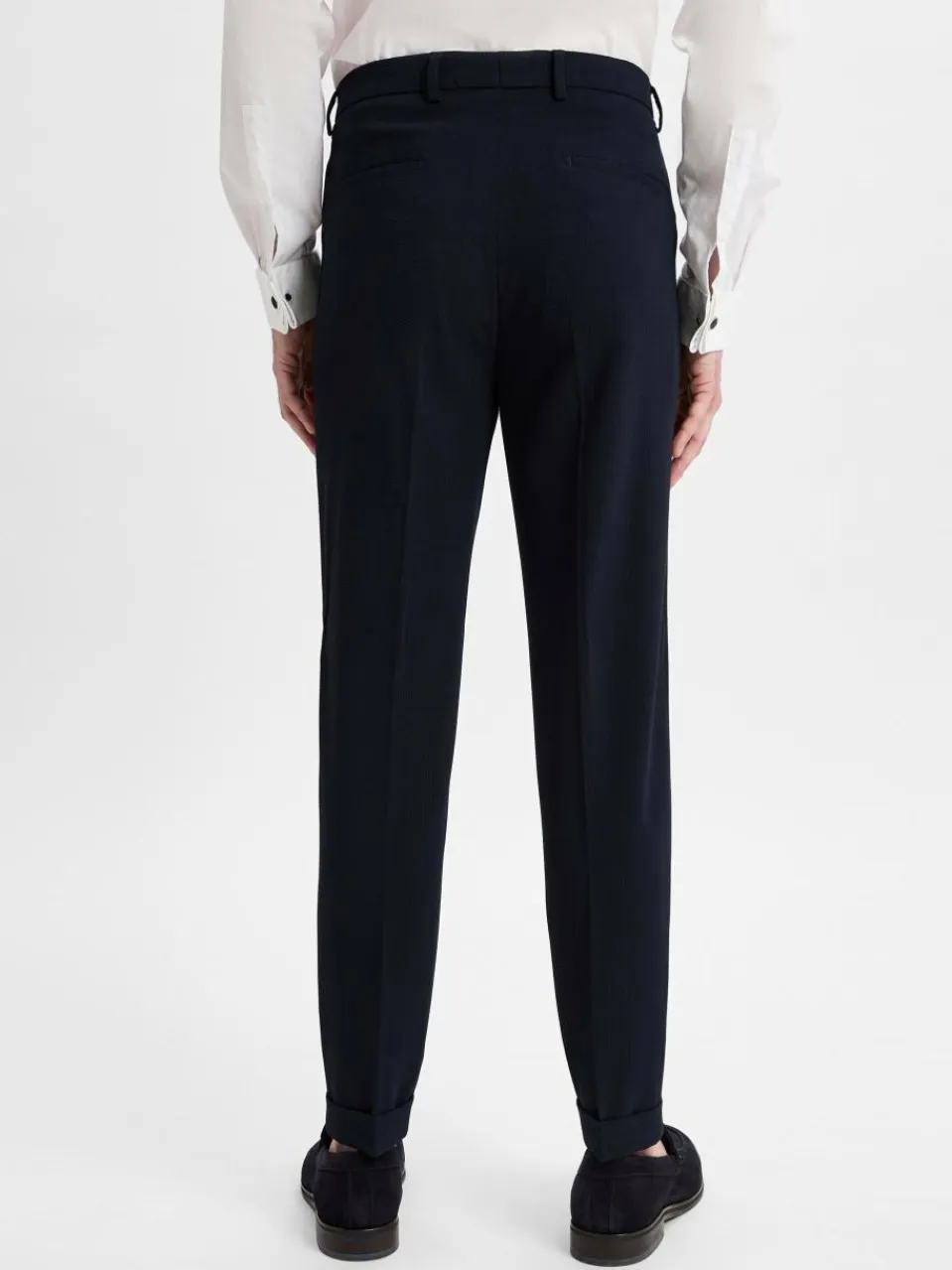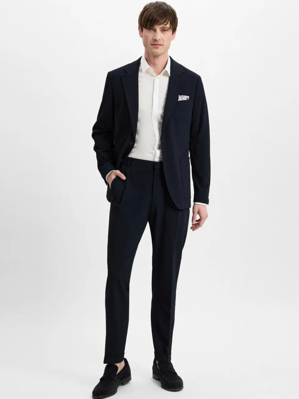 Die Anzughose Torino von Benvenuto hat einen modernen Schnitt und ist aus einer Kunstfaser-Qualität, die sich durch ihre Struktur angenehm anfühlt. Die Hose ist Teil eines Baukasten-Anzugs, kann aber auch allein getragen werden.