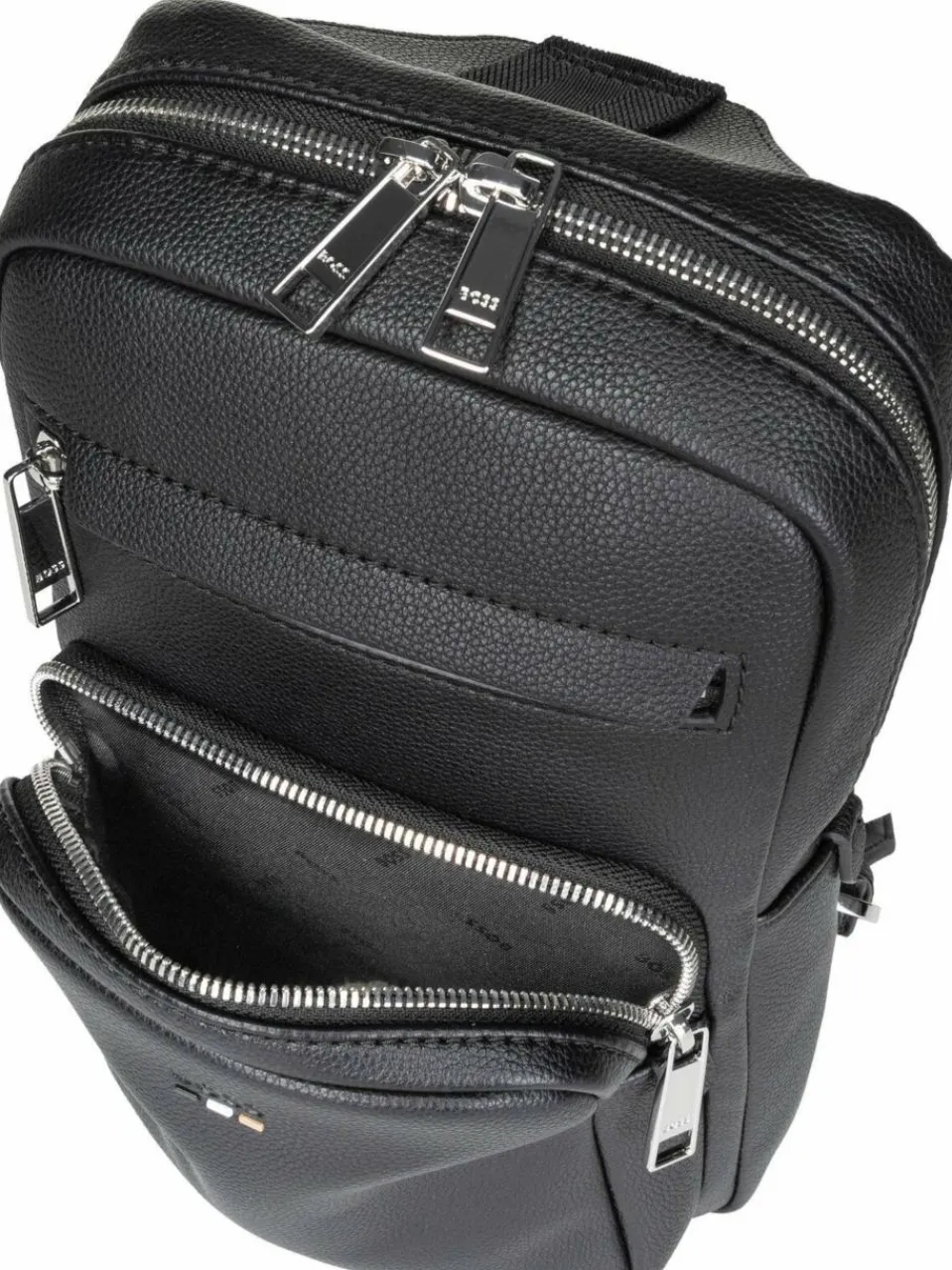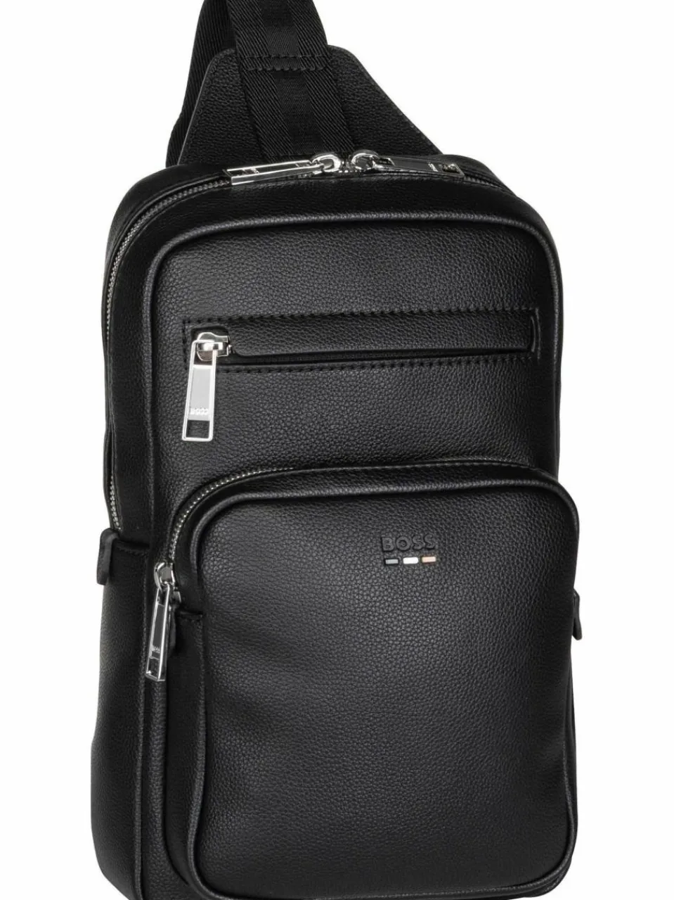 Diese Sling Bag von BOSS vereint Komfort und modernes Design in einer kompakten, eleganten Tasche aus genarbtem Kunstleder. Ideal für den urbanen Alltag, bietet sie ausreichend Stauraum und intelligente Fächer.