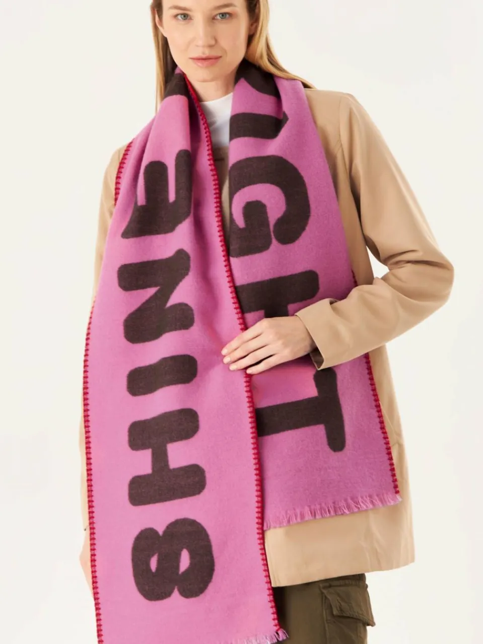 Hier ist unser Schal-Favorit für alle, die es warm und kuschelig mögen. Der Schal ist in modisch schmaler Form mit Kontrast-Stitching und plakativem SHINE BRIGHT Statement designt und kann von beiden Seiten getragen werden. Er wurde aus unserer kuscheligen #5 COZY FEELING Qualität gefertigt. Es handelt sich dabei um eine gewebte Qualität, bei der aus unterschiedlich eingefärbten Garnen plakative Muster und Designs entstehen.