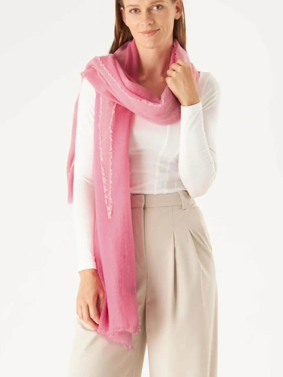 Dieser kostbare Premium Schal wurde mit großer Sorgfalt in einer kleinen mongolischen Manufaktur in Fil Coupé Technik gefertigt, in der handwerkliche Kunst eine lange Tradition hat. Der sehr fein gewebte XL-Schal aus wertvoller Wolle und luxuriösem Kaschmir wird höchsten Ansprüchen an Qualität und Verarbeitung gerecht. Er wurde doppelt gewebt und anschließend so ausgeschnitten, dass ein exklusives Two-Tone-Muster in puristischer Anmutung mit schönem Melange-Effekt entsteht.