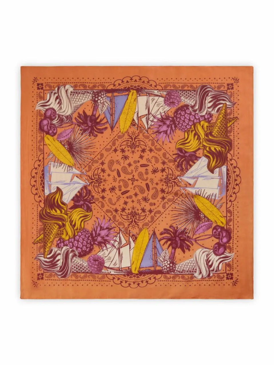 Sommerlich elegant – das perfekte Bandana für den stilvollen Look. Dieses exklusive Carré aus einem edlen Baumwoll-Seide-Mix kombiniert den klassischen Paisley-Print mit verspielten, sommerlichen Symbolen. An den Ecken findest du aufwändig eingearbeitete Motive wie Ananas, Surfbrett, Softeis, Palme und Segelboot – die perfekte Mischung aus Eleganz und fröhlichem Sommerflair.