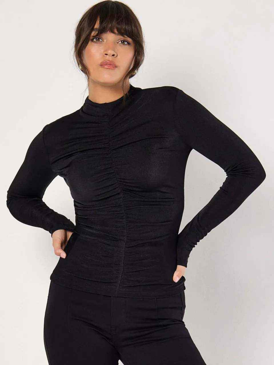 Mit seiner figurbetonten Passform ist dieses Oberteil die perfekte Wahl für das Abendoutfit. Es ist aus einem Stretch-Stoff mit dezentem Glanz gefertigt und verfügt über schmeichelhafte Rüschen an der Vorderseite, lange Ärmel und einen Rundhalsausschnitt.