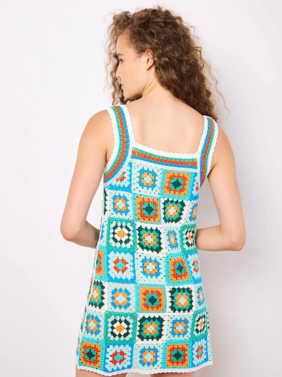 Mit seinem farbenfrohen Design aus gehäkelten Quadraten ist dieser Mini ein Must-Have für die Festivalsaison. Es ist mit einem nudefarbenen Slip gefüttert und hat eine schmeichelhafte, figurbetonte Passform sowie ein ärmelloses Design.