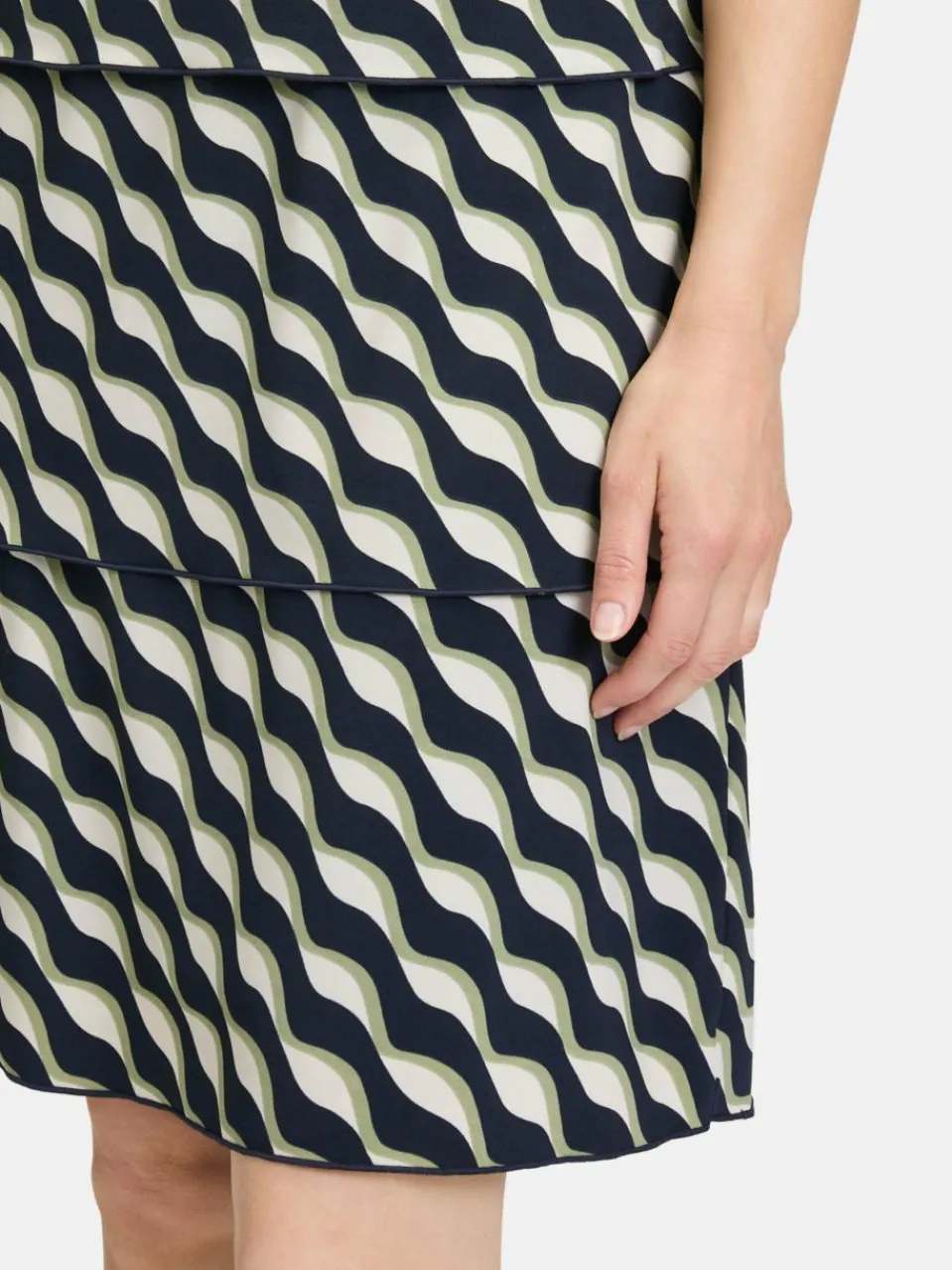 Dieses Stufenkleid überzeugt mit einem modernen grafischen Druck und einer femininen, geraden Silhouette, die angenehm locker fällt und viel Bewegungsfreiheit bietet. Die stufenförmige Gestaltung verleiht dem Kleid eine verspielte Leichtigkeit, während der Verzicht auf einen Verschluss das An- und Ausziehen unkompliziert macht. Ein vielseitiges Kleid, das mit seinem stilvollen Design sowohl im Alltag als auch zu besonderen Anlässen begeistert.