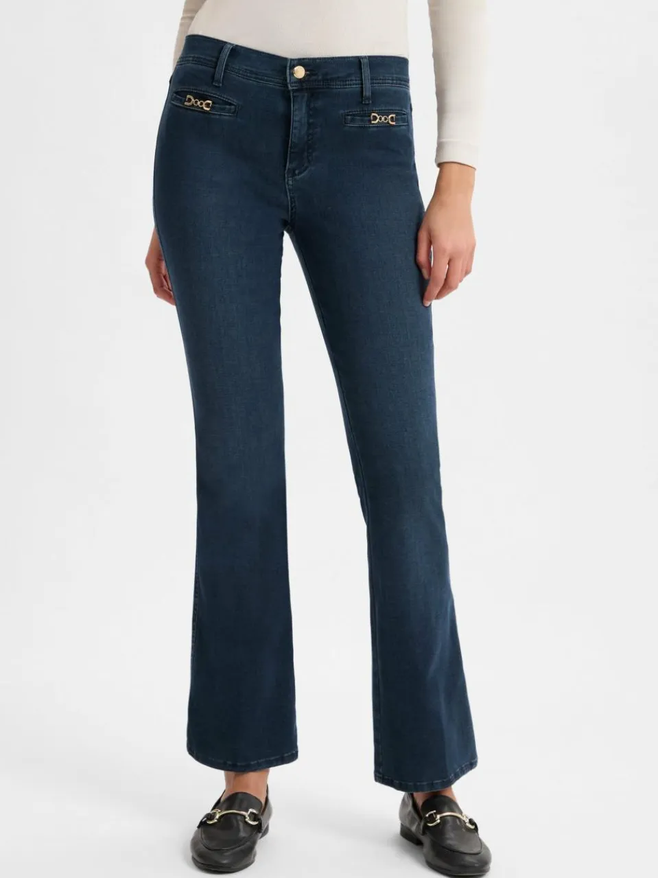 Die BRAX Jeans Shakira vereint eine schlanke Silhouette mit elastischem Stretch-Denim, der sich harmonisch an die Körperform anschmiegt und mit eleganten Broschen an den Taschen kunstvolle Akzente setzt.