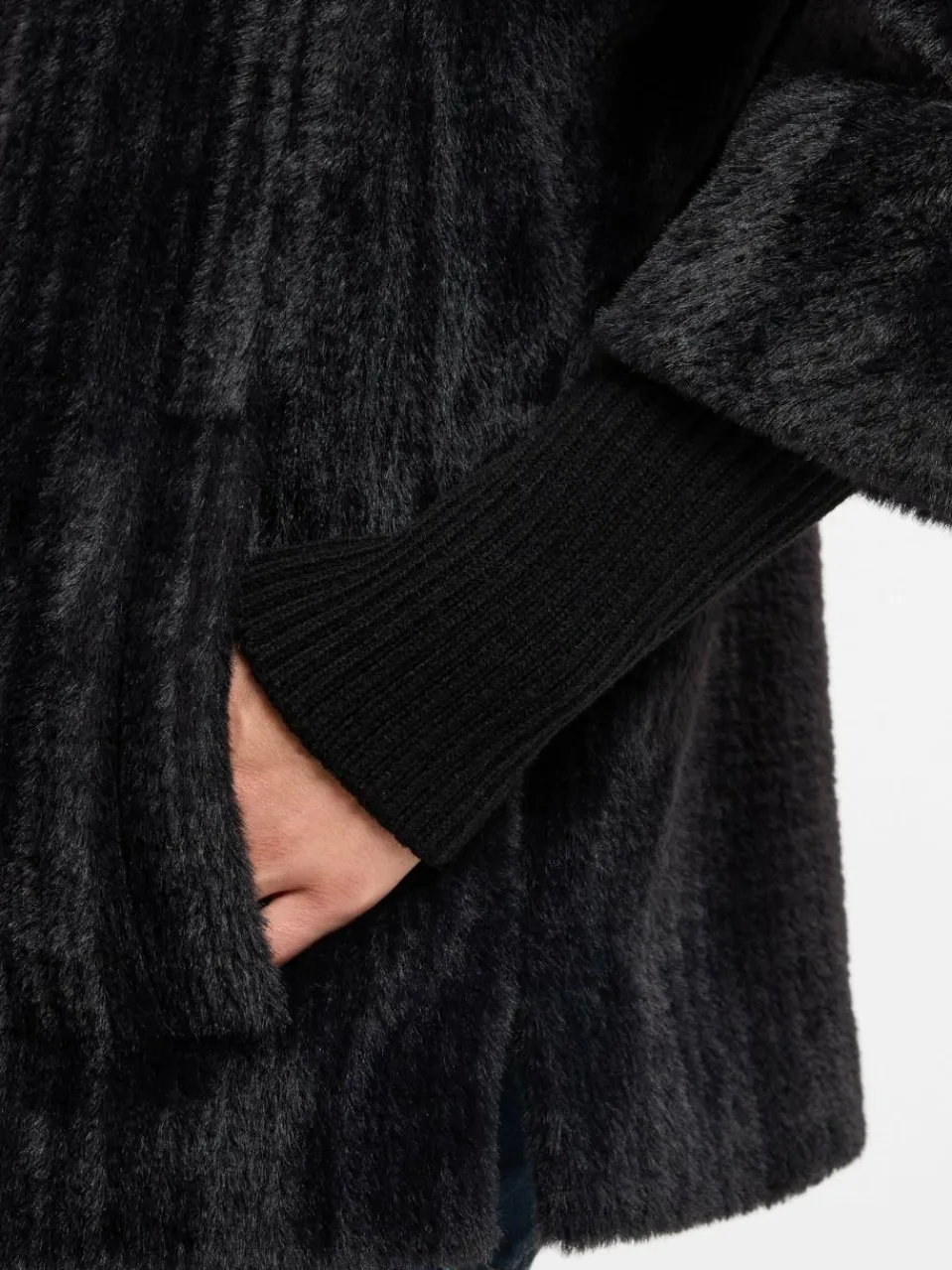 Cool und cozy – so zeigt sich die kuschelweiche Faux-Fur-Jacke von comma mit geripptem Stehkragen und extralangen Ärmelbündchen und rundet den Freizeit-Look exklusiv ab.