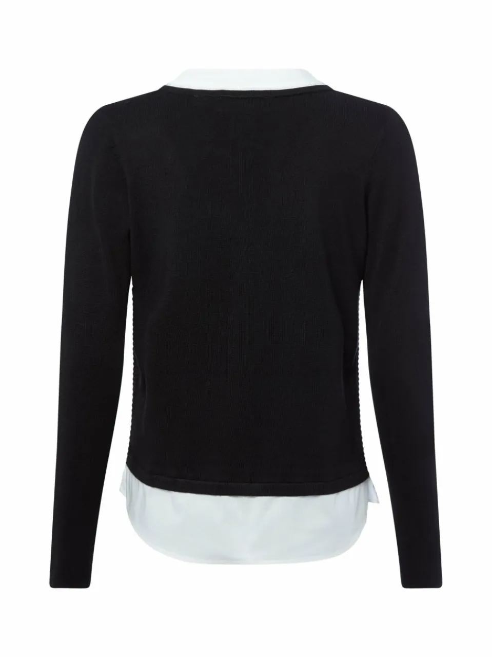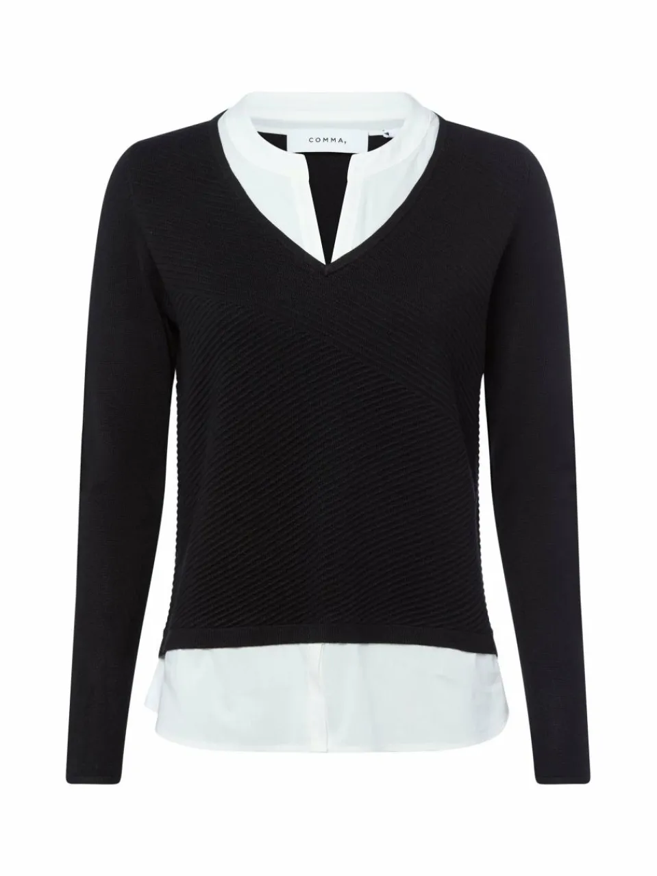 Müheloser Allrounder für casual smarte Looks: Der Feinstrickpullover von comma zeigt sich im 2-in-1 Design mit kontrastfarbigen Einsätzen am Ausschnitt und Saum.
