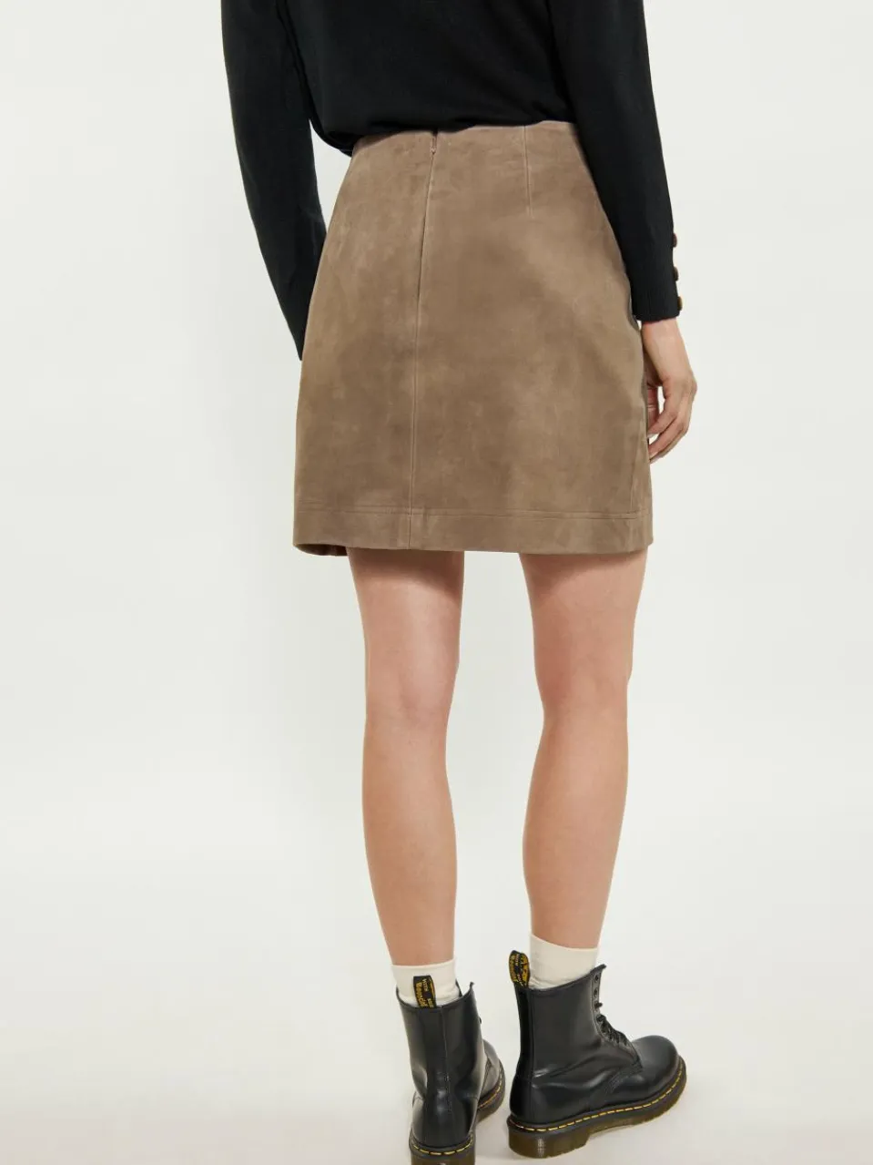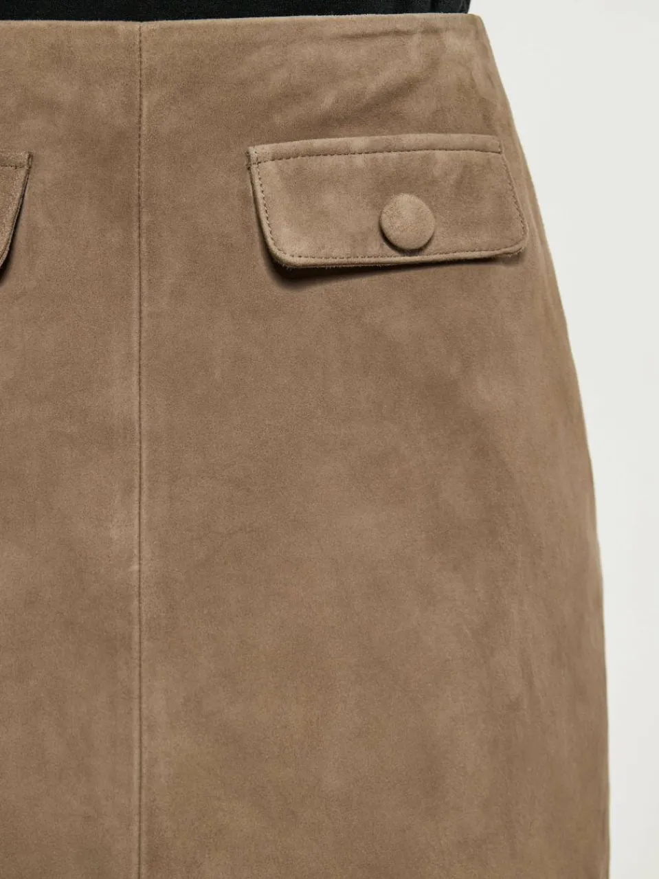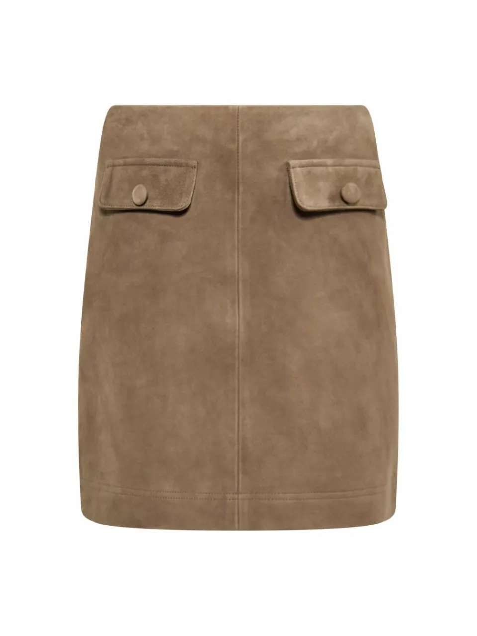 Dieser hoch taillierte, gerade geschnittene Rock endet oberhalb des Knies und strahlt Raffinesse aus. Die glatte Vorderseite und die aufgesetzten Taschen mit Knöpfen verleihen ihm eine elegante Note. Aus weichem Material in Wildlederoptik gefertigt, das eine strukturierte Oberfläche bietet, kombiniert er Struktur und Flexibilität in der Passform. Mit sauberem Saum und verdecktem Verschluss ist dieser Rock perfekt für alle, die einen gepflegten und dennoch vielseitigen Look suchen.