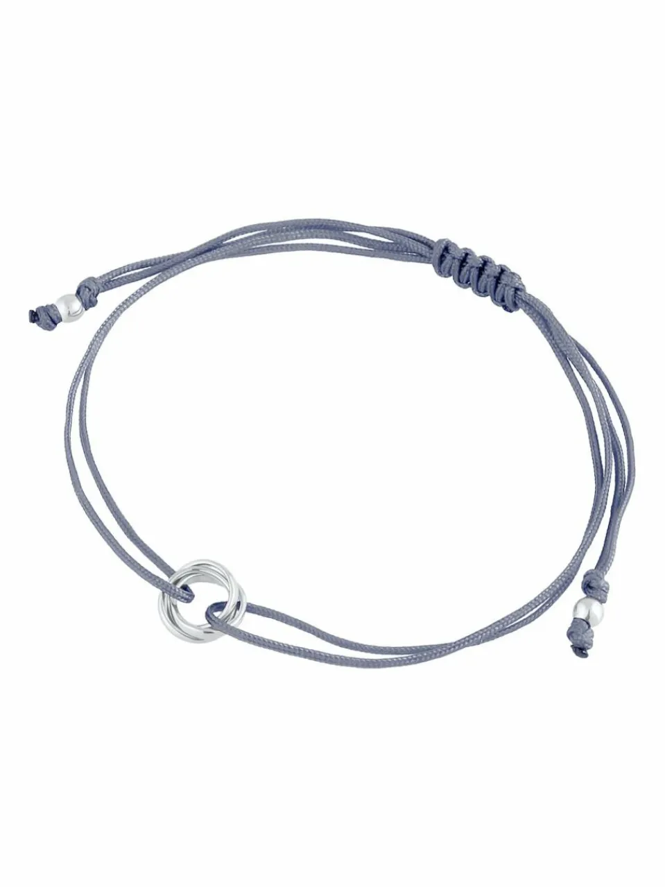 Diese runden ineinander verschlungenen Silberringe verleihen einen wunderschön verspielten Look. Die zeitlose Kombination aus den runden Kreiselementen und dem blau-grauen Textilarmband schafft ein elegantes Stück, das jedem Outfit Raffinesse verleiht. Ein unverzichtbarer Schmuck für jedes Frauenhandgelenk mit Stil!