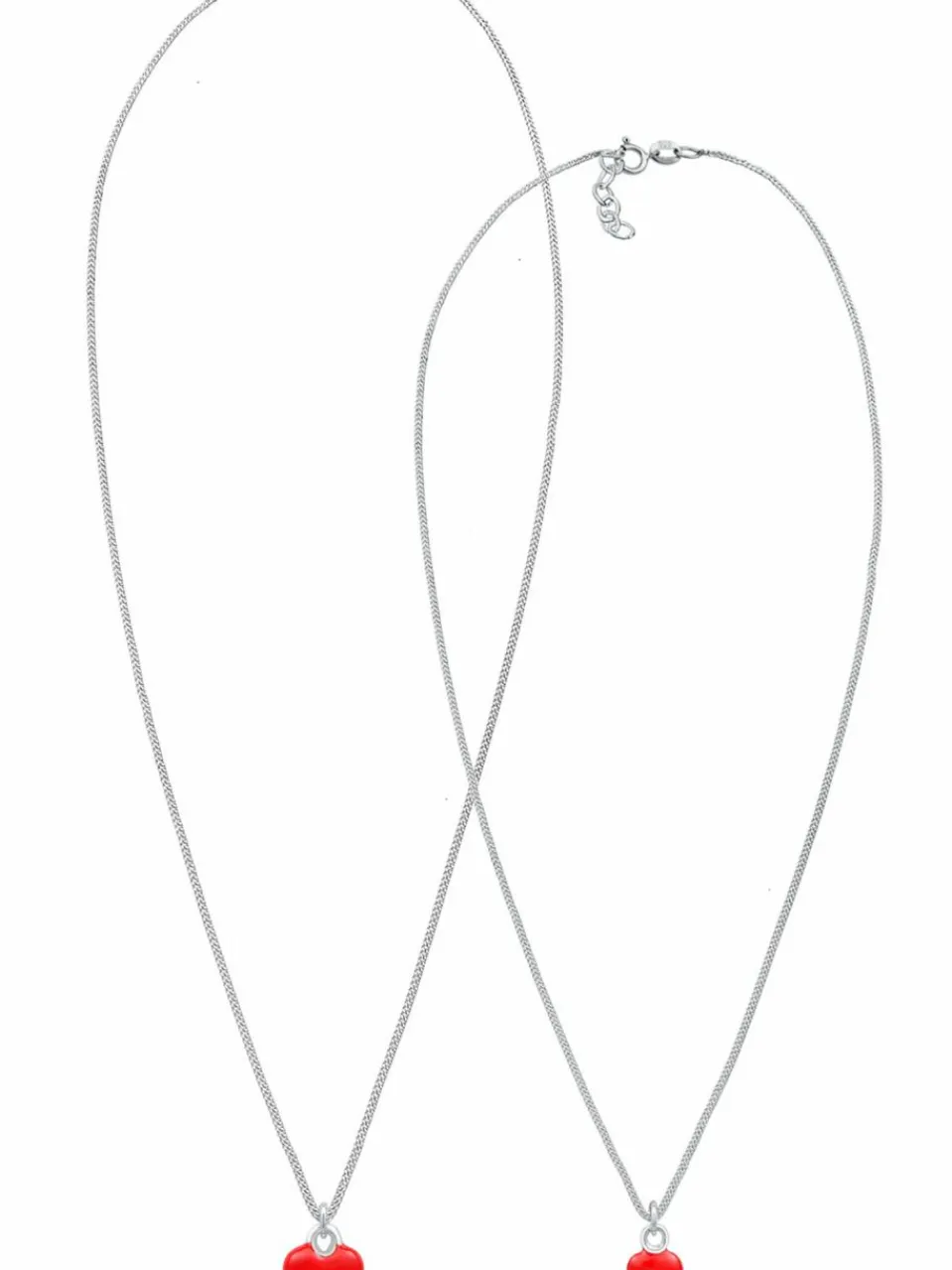 Wer diese Kette trägt, ist nie allein. Denn das Set besteht aus zwei Schmuckstücken und symbolisiert die Verbundenheit von Mutter und Tochter. Das modische Schmuckstück aus feinstem 925er Sterling Silber ist ein Must-Have für jede modische Mutter und ihre Tochter, die sich mit hochwertigen Materialien elegant in Szene setzen möchten. Das rote Herz wurde mit Emaille veredelt und soll die unendliche Liebe zwischen Mutter und Kind zeigen und verleiht jedem Outfit ein besonderes Strahlen. Auch als Geschenk eignet sich dieses trendige Schmuckstück hervorragend. Länge der Ketten: 45cm und 36cmZum Schutz der unserer Kleinsten empfehlen wir das Tragen von Schmuckstücken für Kinder unter 3 Jahren nur unter Aufsicht von Erwachsenen, da kleine Teile unter Umständen verschluckt werden könnten.