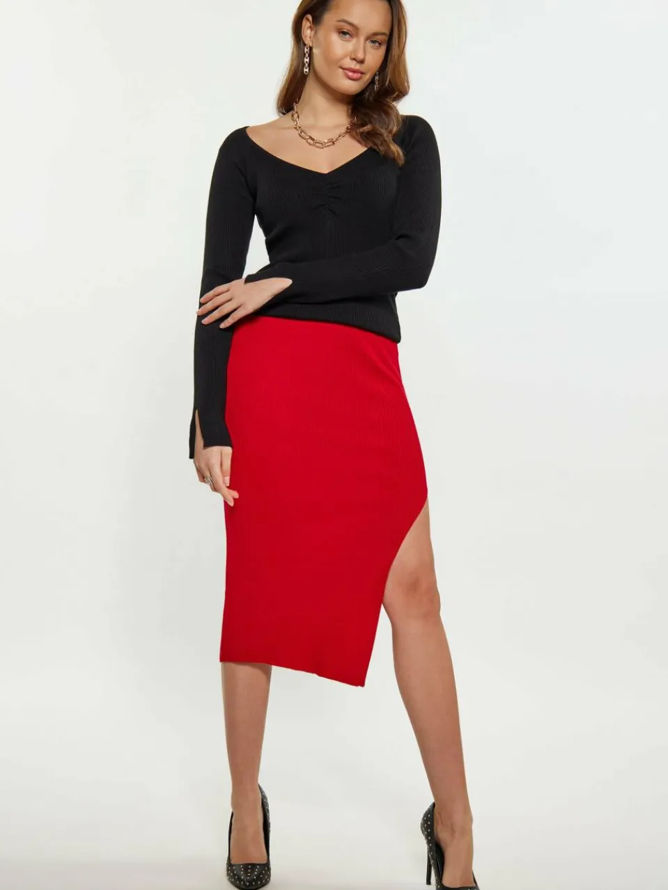 This ribbed knit midi skirt is a summer wardrobe essential. The fitted silhouette with an elasticated waistband ensures a comfortable and snug fit. Featuring a slit for added flair, this pull-on style contour skirt is designed to flatter your figure effortlessly. Perfect for everyday wear, the ribbed texture adds visual interest to this basic yet stylish piece. This product is a part of Classic Rib Collection