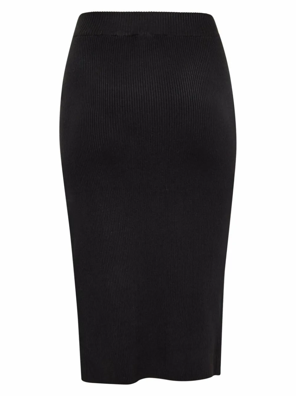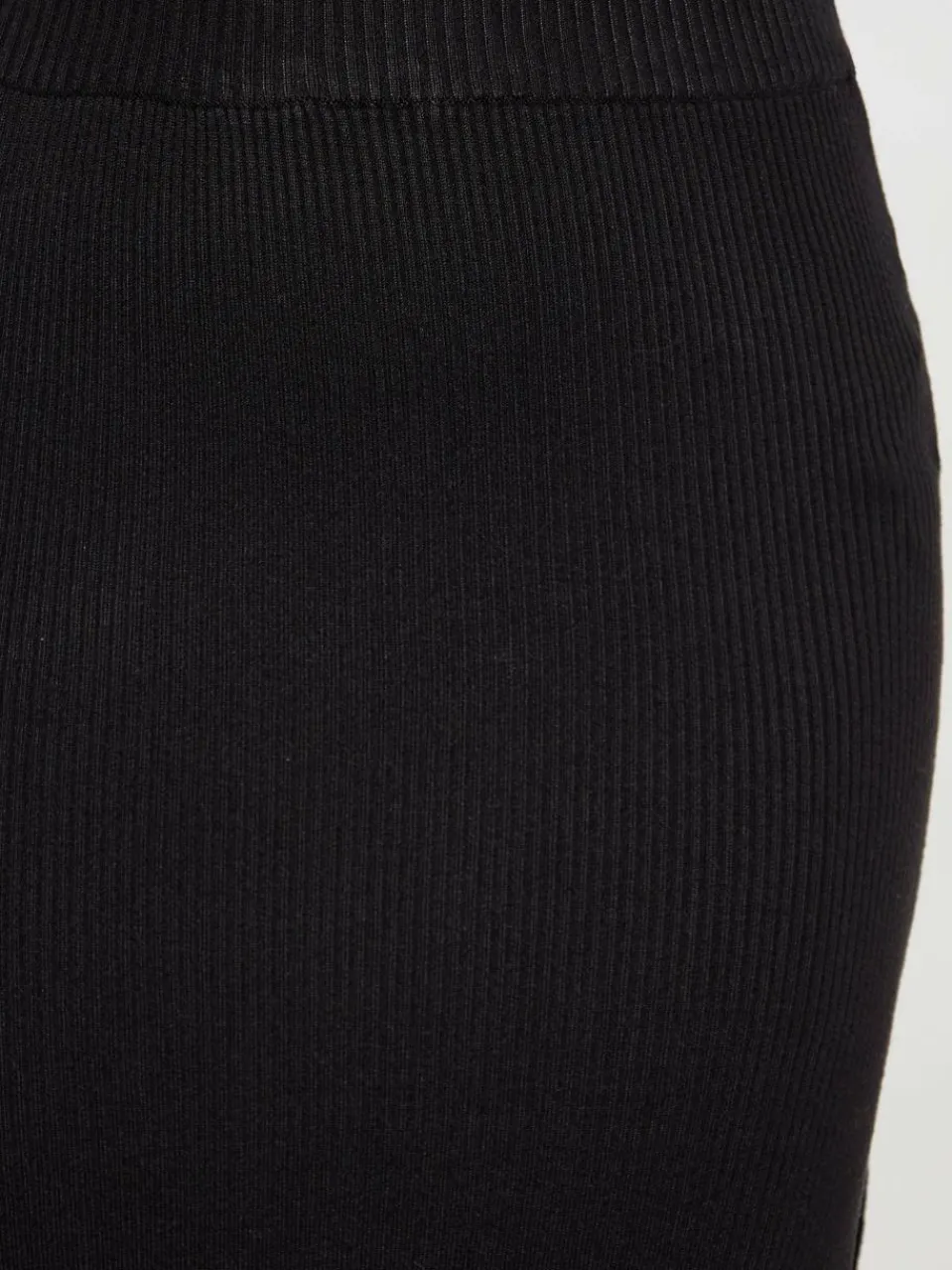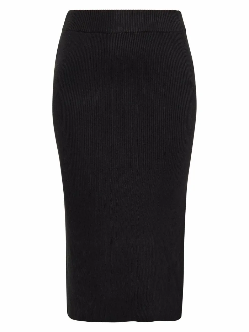 This ribbed knit midi skirt is a summer wardrobe essential. The fitted silhouette with an elasticated waistband ensures a comfortable and snug fit. Featuring a slit for added flair, this pull-on style contour skirt is designed to flatter your figure effortlessly. Perfect for everyday wear, the ribbed texture adds visual interest to this basic yet stylish piece. This product is a part of Classic Rib Collection
