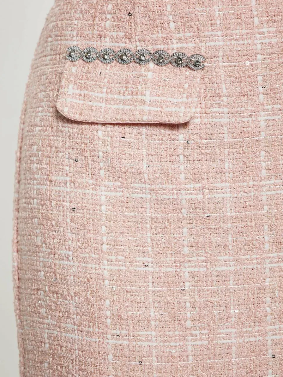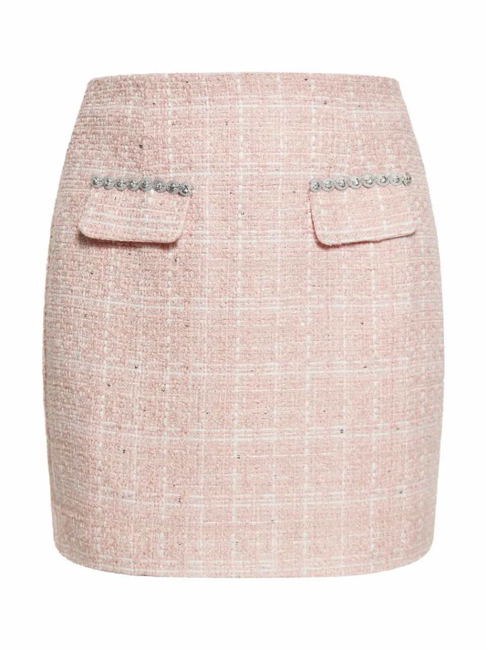 Introducing the bouckle mini skirt featuring a textured fabric with woven or tweed-like quality. Adorned with small, decorative applications for a subtle sparkle. The smooth waistband ensures a secure fit while the flap pockets and decorative elements add an elegant touch to this clean, tailored design. Perfect for formal or semi-formal occasions. This product is a part of Boucle Collection