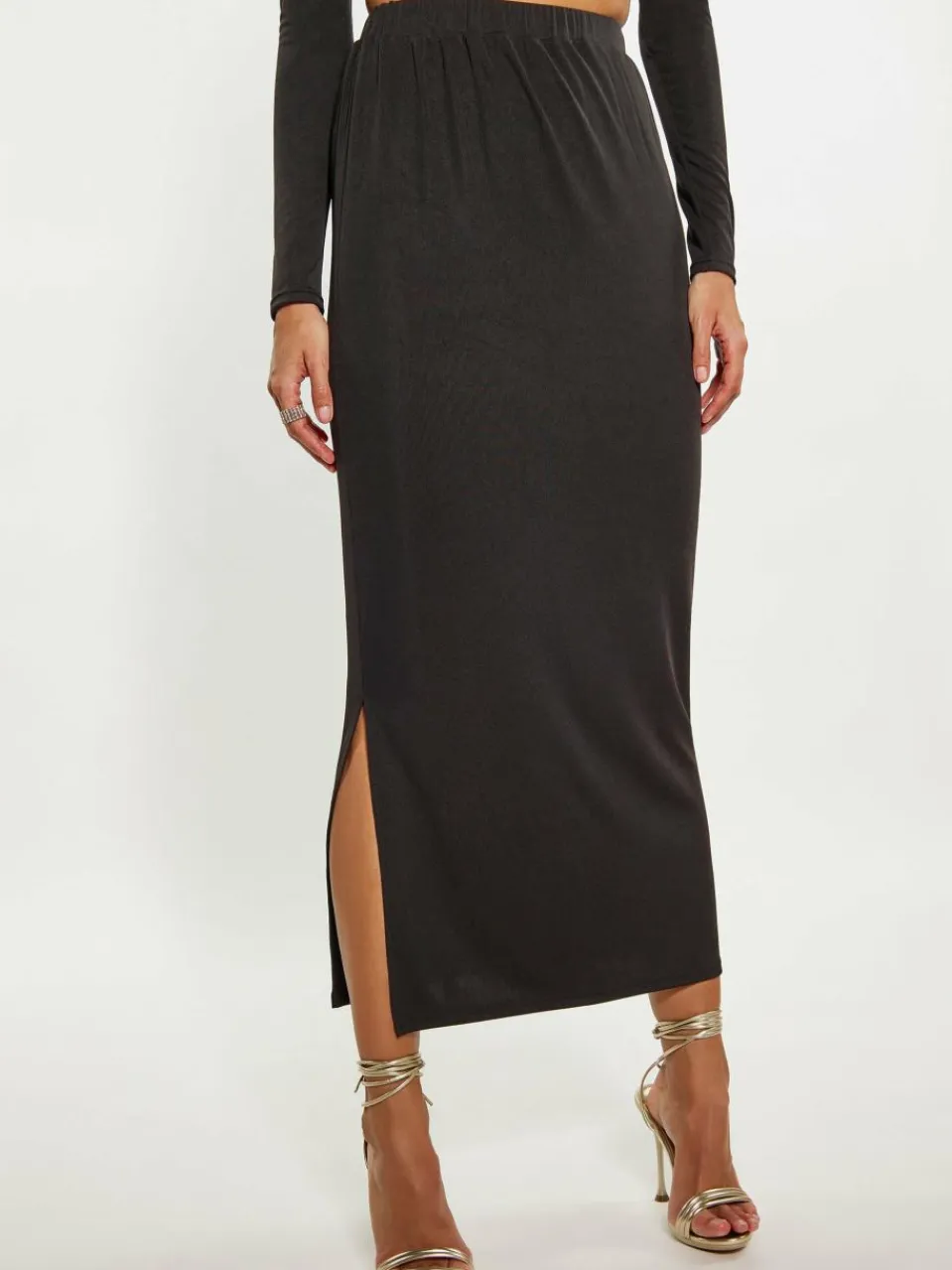 Enhance your look with this ruched elastic-rib skirt. The bodycon design hugs your curves, while the stretchy elastic waistband ensures a comfortable fit. Perfect for a night out, this midi skirt falls elegantly to the knee or lower, creating a sleek and stylish silhouette. Ideal for those who love a pencil midi skirt style with added flair. This product is a part of Party Mix Collection