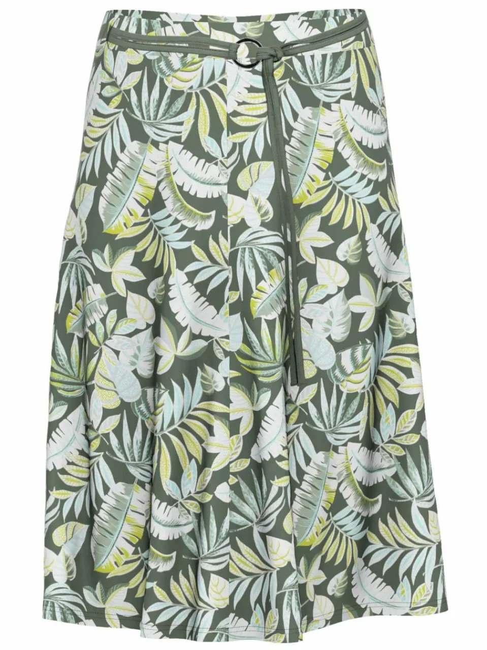 Entdecken Sie die Leichtigkeit des femininen Jerseyrocks in kniebedeckender Länge. Der ausgestellte Schnitt schmeichelt jeder Figur und bietet dank des Comfortbundes optimalen Tragekomfort. Das Material, ein weicher Viskose-Jersey, präsentiert sich mit einem lebhaften Blätterprint in Dschungeloptik.