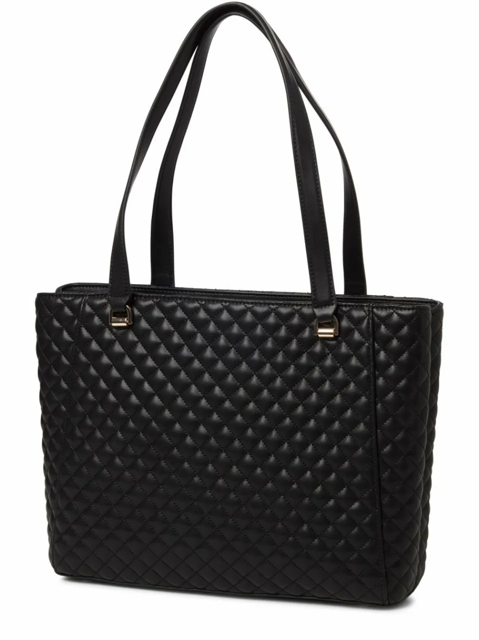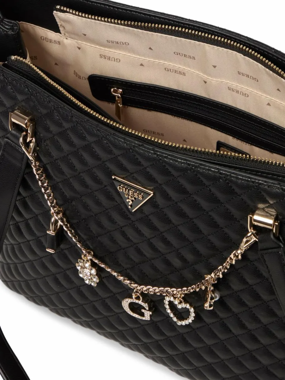 Im raffinierten Design aus gestepptem Kunstleder mit Zier-Gliederkette und funkelnden Anhängern begeistert die Guess Tasche Everlee als Highlight-Accessoire.