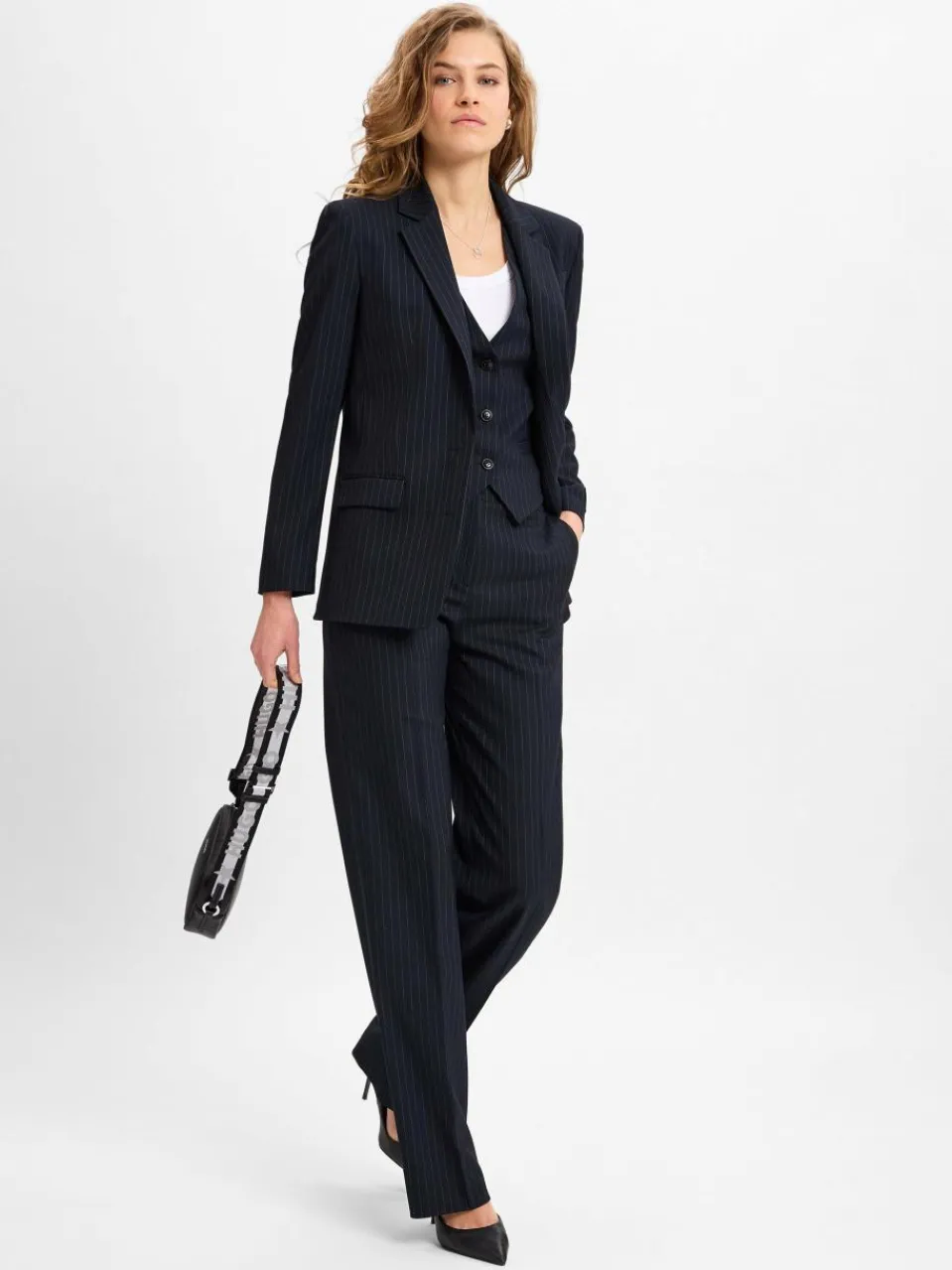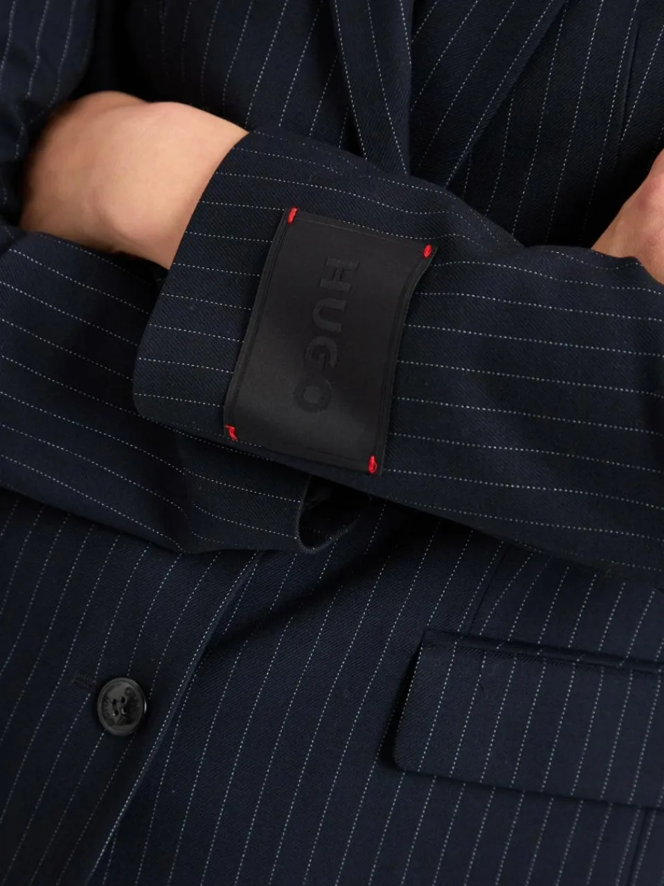 Der smarte Blazer Anatali von HUGO ist mit seinem Nadelstreifenmuster ein absoluter Klassiker und lässt sich besonders gut zu passender Hose und Weste kombinieren.