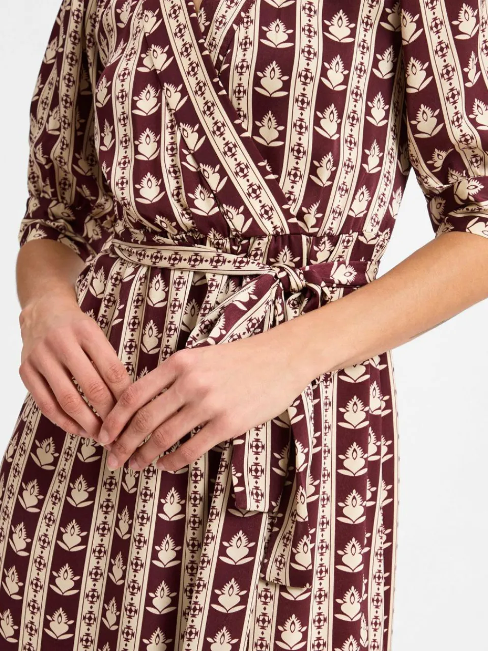 Das IPURI Kleid besticht durch einen verführerischen Wickel-Look, der durch Ballonärmel und einen trendorientierten Volantsaum eine feminin-verspielte Note erhält.