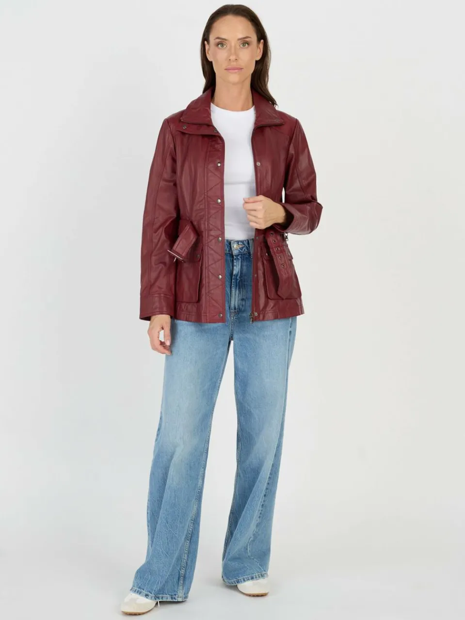 Diese trendige Lederjacke der Marke JCC wird mit einem verdecktem Reißverschluss geschlossen und verfügt über aufgesetze Druckknopftaschen. Ziernähte an Schultern sowie der markante Gürtelverschluss an der Taille setzen dezente Highlights. Der leicht taillierte Schnitt sorgt für eine feminine Silhouette und vielseitige Styling-Möglichkeiten, wodurch das Modell sowohl im Alltag als auch bei besonderen Anlässen eine perfekte Wahl darstellt.