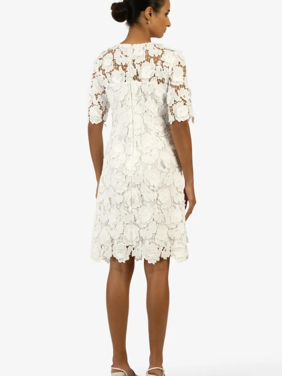 Die flächige Spitze mit 3D-Optik, kombiniert mit einem klaren Schnitt und halbdurchsichtigen Partien, macht es ideal für besondere Anlässe mit Stil.