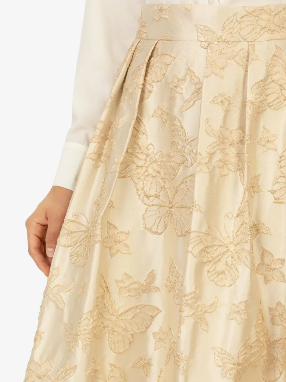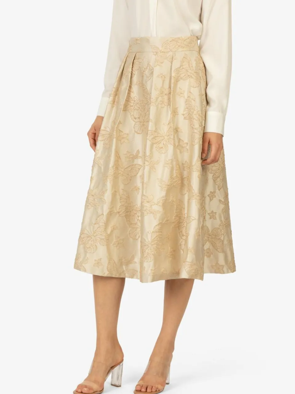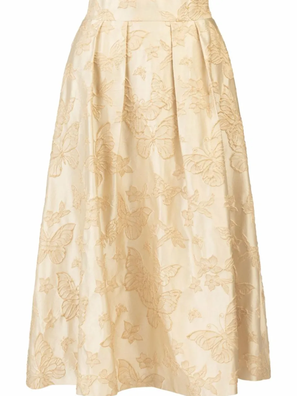 Dieser edle Abendrock besticht durch seinen hochwertigen Jacquard-Stoff mit zartem, floralen Muster. Die hohe Taille und der weit schwingende Schnitt zaubern eine feminine und stilvolle Silhouette. Die fließende Midi-Länge macht den Rock zur perfekten Wahl für elegante Abendveranstaltungen, Hochzeiten oder festliche Anlässe. Dank des verdeckten Reißverschlusses hinten lässt sich der Rock bequem an- und ausziehen, ohne die elegante Optik zu stören.
