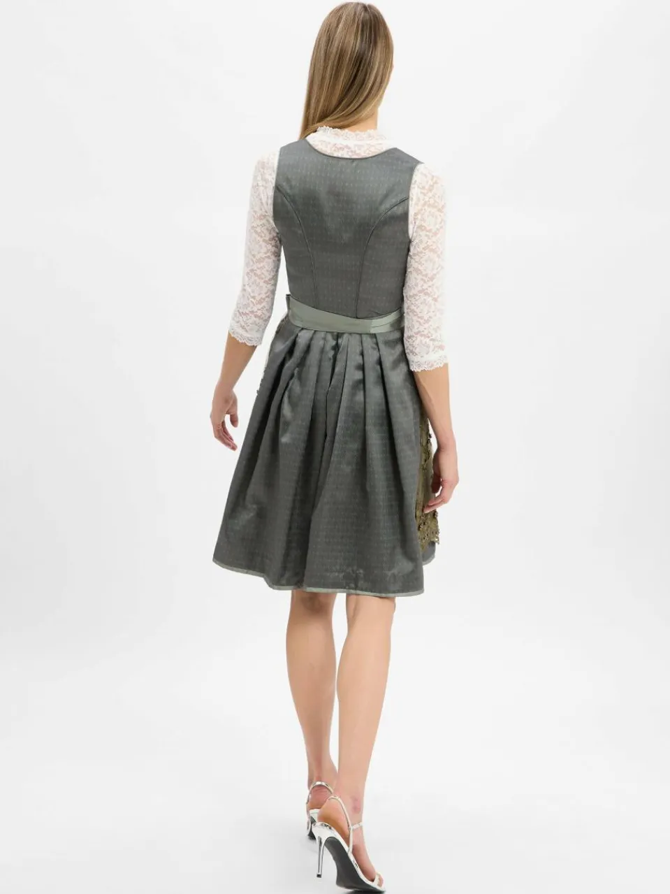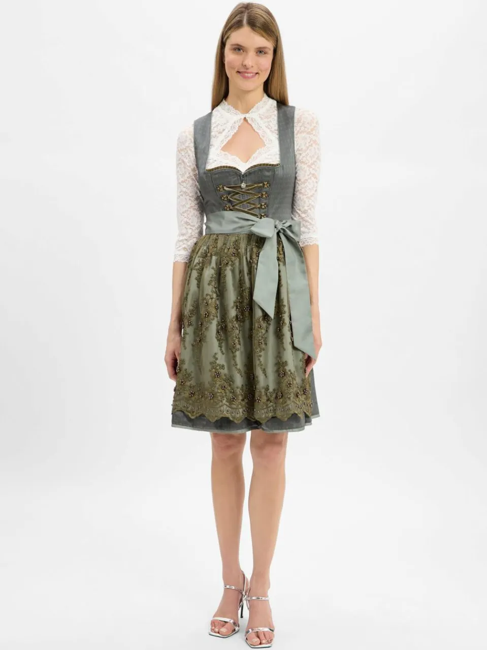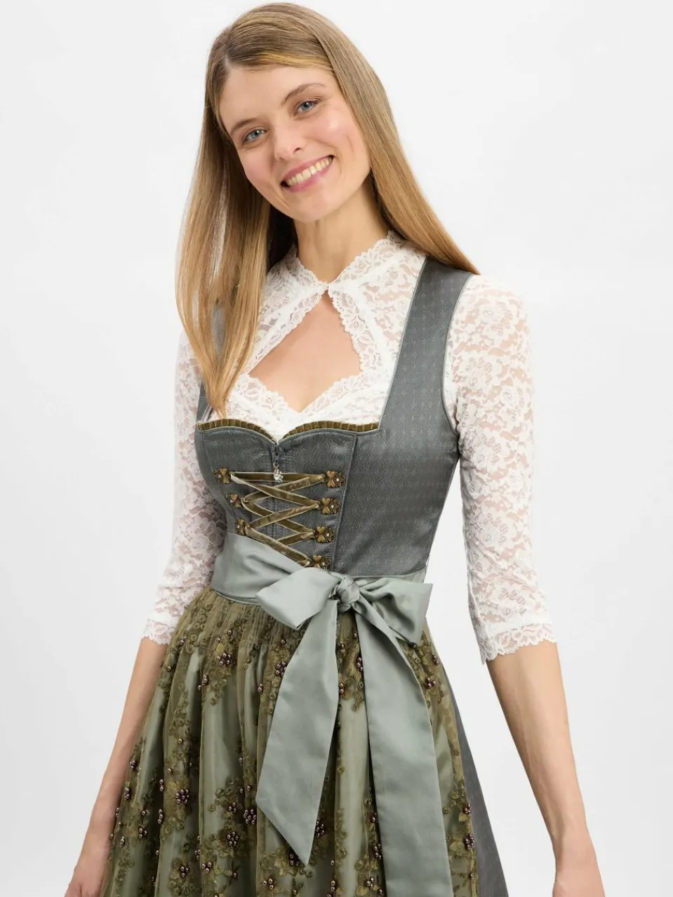 Das Dirndl von Krüger Dirndl begeistert mit seinen liebevollen Details – ein Herz-Ausschnitt mit zarter Bordüre trifft auf eine aufwendig verzierte Schürze.