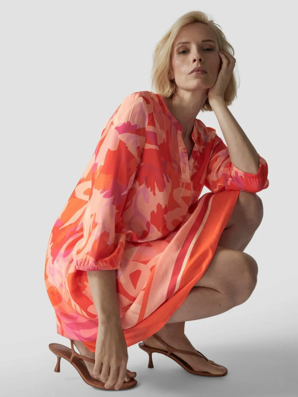 Mit seinem lebendigen Allover-Print und dem locker fallenden Schnitt ist dieses Kleid ein echtes Statement-Piece. Der feminine V-Ausschnitt und die 3/4-Ärmel mit elastischem Abschluss unterstreichen die legere Silhouette.Das fließende Material sorgt für angenehmen Tragekomfort – perfekt für Urlaub, Freizeit oder einen stilvollen City-Look.Farbintensives Design mit floralem Muster.Lockerer, gerade geschnittener Stil für viel Bewegungsfreiheit.V-Ausschnitt für eine feminine Note.3/4-Ärmel mit elastischem Bund.Leichtes, weiches Material – ideal für Frühling und Sommer.