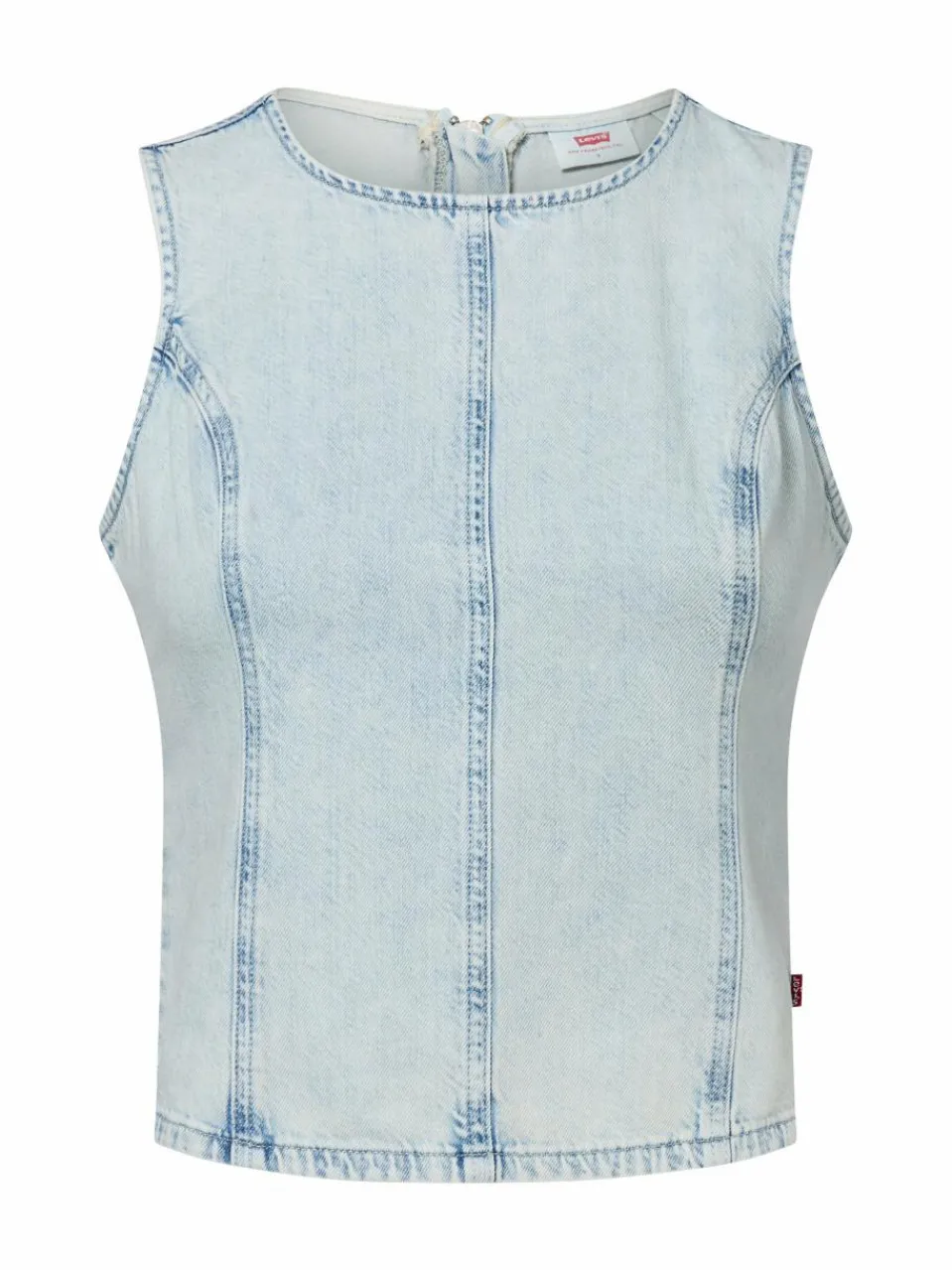 Das Levi’s Blusentop aus gebleachtem Denim mit markanten Nähten und durchgehendem Reißverschluss am Rücken verleiht dem Look mühelos ein edgy Finish.