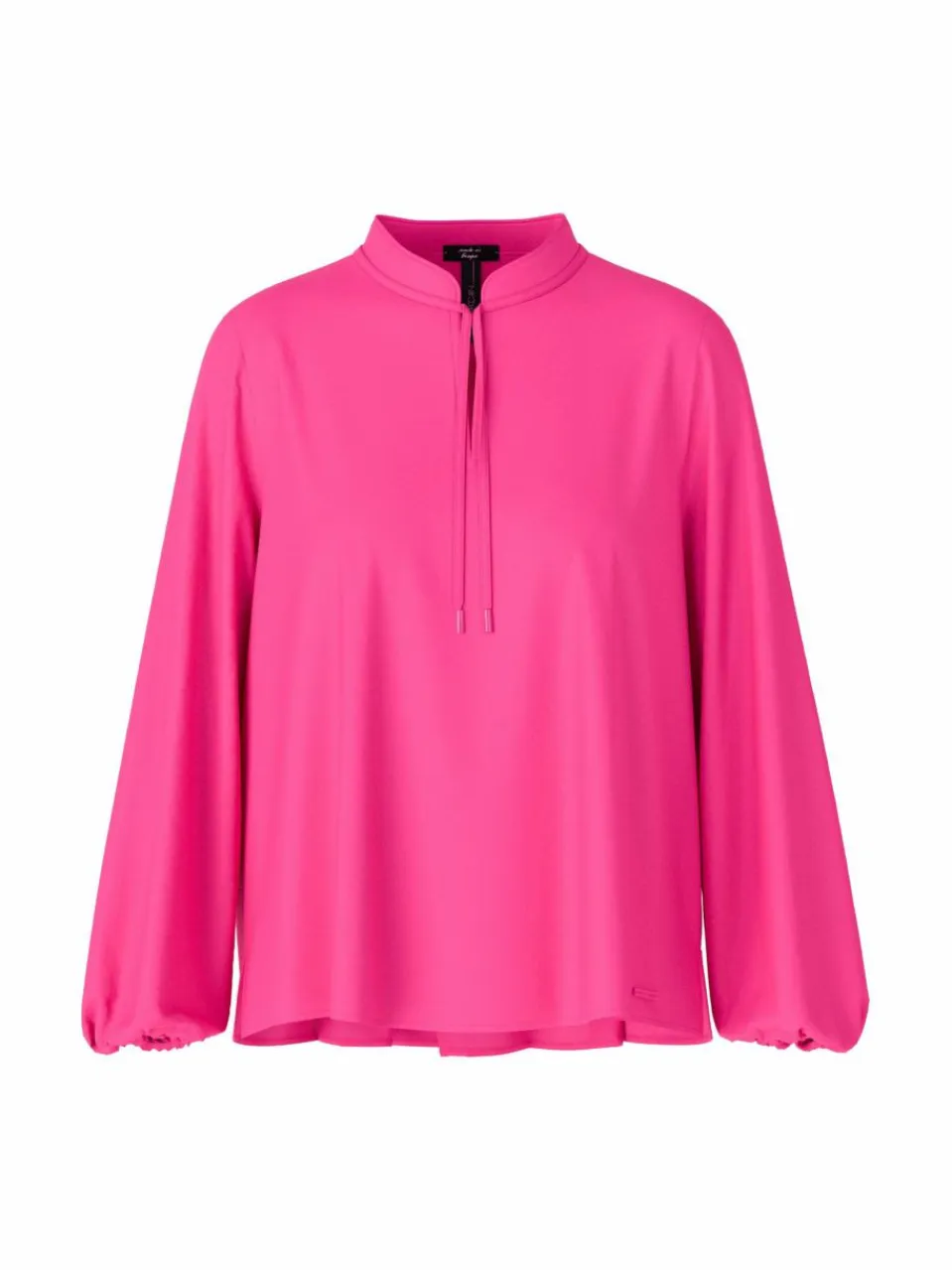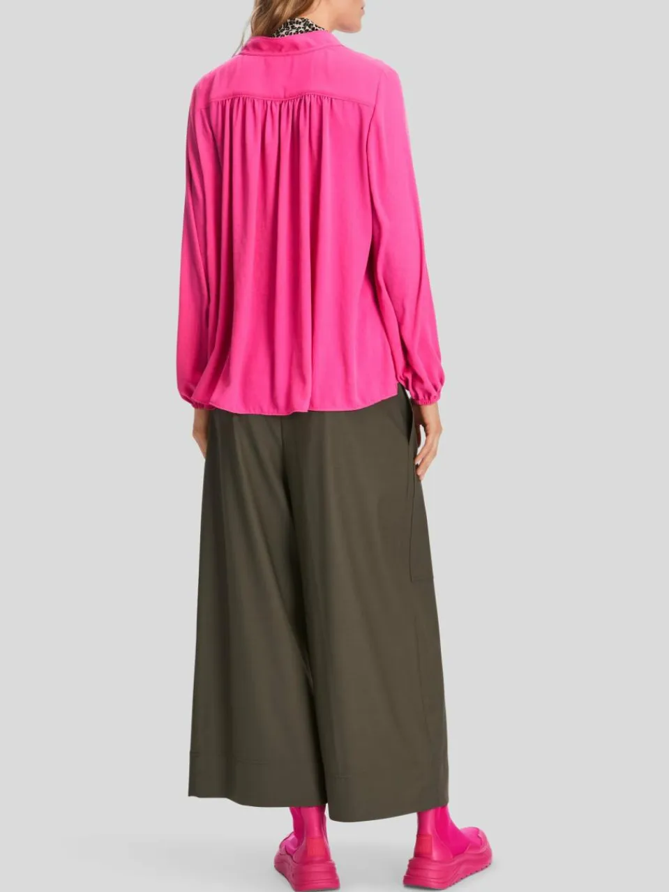 Bluse aus weichfallendem Gewebe. Der Schnitt ist schmal in der Schulter und weit in Vorder- und Rückenteil. Das Volumen konzentriert sich im Rückenteil, das ab der Schulterpasse gekräuselt ist. Im Ärmelsaum findet sich ein Gummizug. Die Halslösung: Schlitz, Stehkragen und Bändchenverschluss.