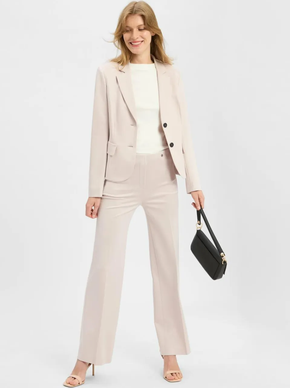 Der Blazer von Marc Cain Collections überzeugt im klassischen Design mit Revers, Knöpfen und angedeuteten Pattentaschen – perfekt im Duo mit der passenden Hose.