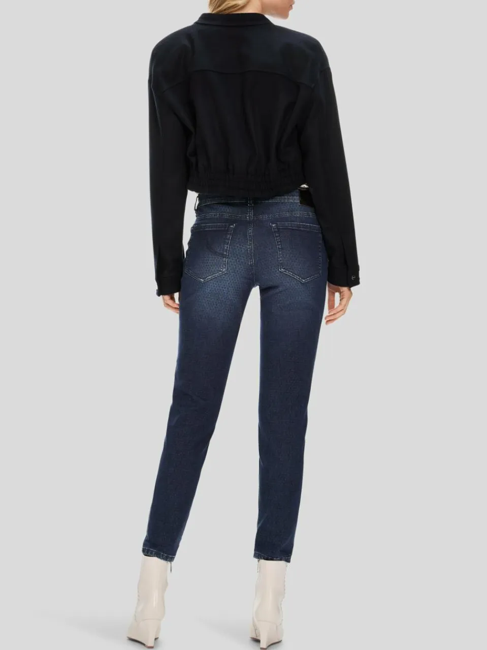 Modell SILVI ist eine schmal und kurz geschnittene Five-Pocket Jeans. Typisch: die tiefe Taille und das konische Bein. Fancy, der dunkle Raster an den hellen Stellen. Die Coin-Pocket ziert eine fransige Kante und eine Glitzerstein-Applikation.
