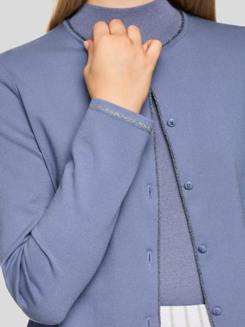 Eleganter Feinstrick Cardigan mit durchgehender Knopfleiste und rundem Ausschnitt. Die schmale Passform und der weiche Viskosemix sorgen für hohen Tragekomfort. Ein dezenter Ringel am Saum und ein kleiner Logoanhänger setzen stilvolle Akzente. Das Modell ist „Knitted in Germany“: Das Verstricken der Garne auf hochmodernen Strickmaschinen und die Veredelung der Stoffe geschehen am Standort Deutschland. Zusammengenäht werden die einzelnen Teile wie Ärmel, Vorderteil etc. in europäischen Partnerbetrieben.