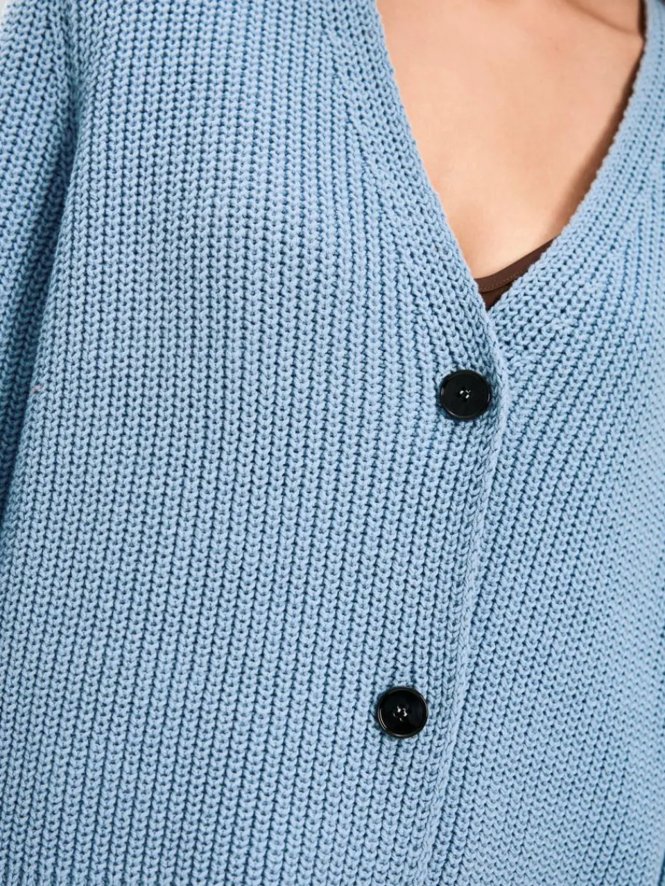 Dieser Cardigan präsentiert einen legeren Rippenstrick. Er hat eine lockere Silhouette und einen V-Neck. Geschlossen wird die Jacke mit Knöpfen. Das Modell ist aus einem soften Baumwollmix „Knitted in Germany“: Das Verstricken der Garne auf hochmodernen Strickmaschinen und die Veredelung der Stoffe geschehen am Standort Deutschland. Zusammengenäht werden die einzelnen Teile wie Ärmel, Vorderteil etc. in europäischen Partnerbetrieben.
