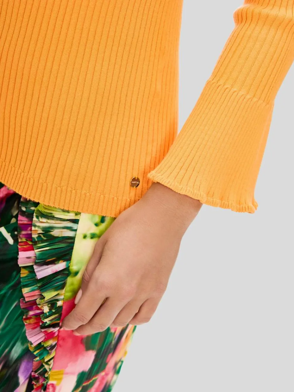 Ein unkompliziertes Basic ist dieser V-Neck-Sweater mit seinem breiten Rippstrick-Dessin. Er besitzt eine leichte Taillierung. Feminine Extras sind die dezenten Volants am Ärmelbündchen sowie die betonten Schultern. Das Modell ist „Knitted in Germany“: Das Verstricken der Garne auf hochmodernen Strickmaschinen und die Veredelung der Stoffe geschehen am Standort Deutschland. Zusammengenäht werden die einzelnen Teile wie Ärmel, Vorderteil etc. in europäischen Partnerbetrieben.