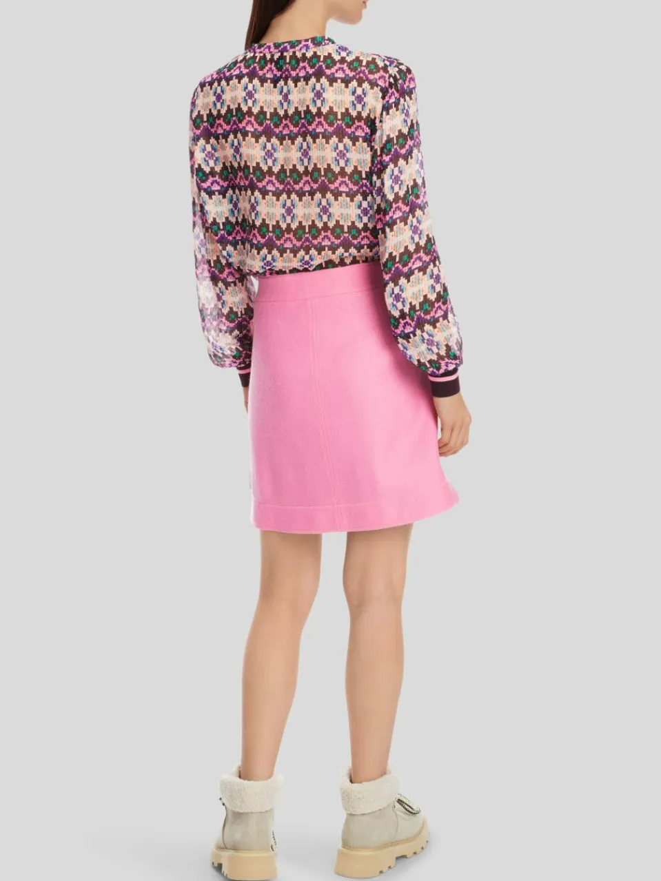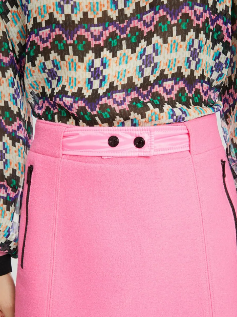 Der minilange Rock ist leicht ausgestellt. Glänzende Nylon-Einsätze am knöpfbaren sowie elastischen Bund ziehen die Blicke an. Gleichzeitig punktet der Rock dank der gewalkten Schurwolle mit warmem und weichem Tragekomfort. Das Modell ist „Knitted in Germany“: Das Verstricken der Garne auf hochmodernen Strickmaschinen und die Veredelung der Stoffe geschehen am Standort Deutschland. Zusammengenäht werden die einzelnen Teile wie Ärmel, Vorderteil etc. in europäischen Partnerbetrieben.