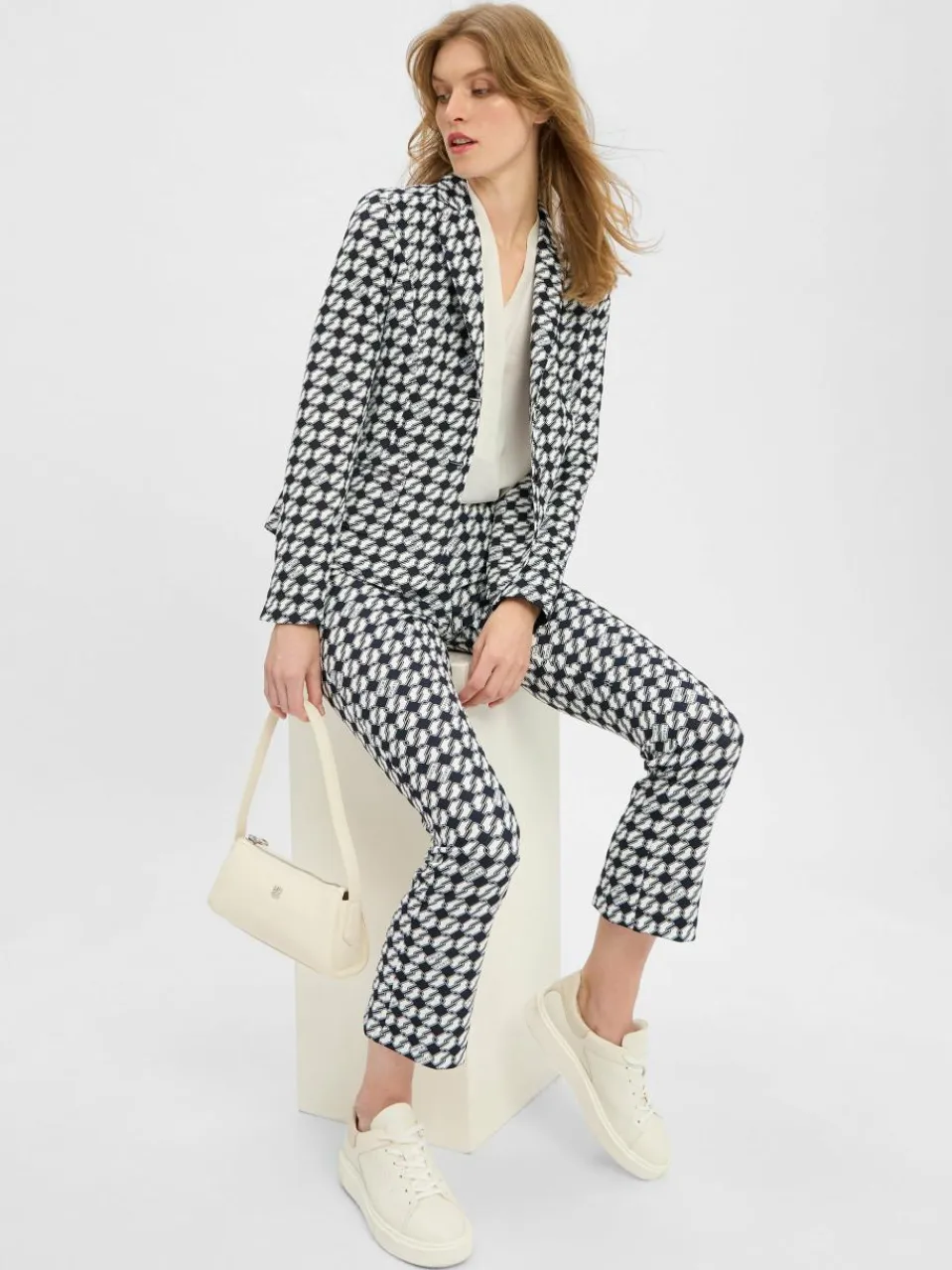 Im Print-Design und mit klassischen Details wie Revers und Knöpfen präsentiert sich der Blazer von Marc Cain Sports als modernes Update für verschiedene Looks.