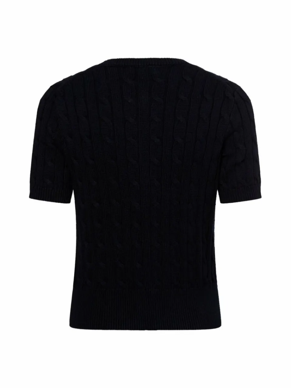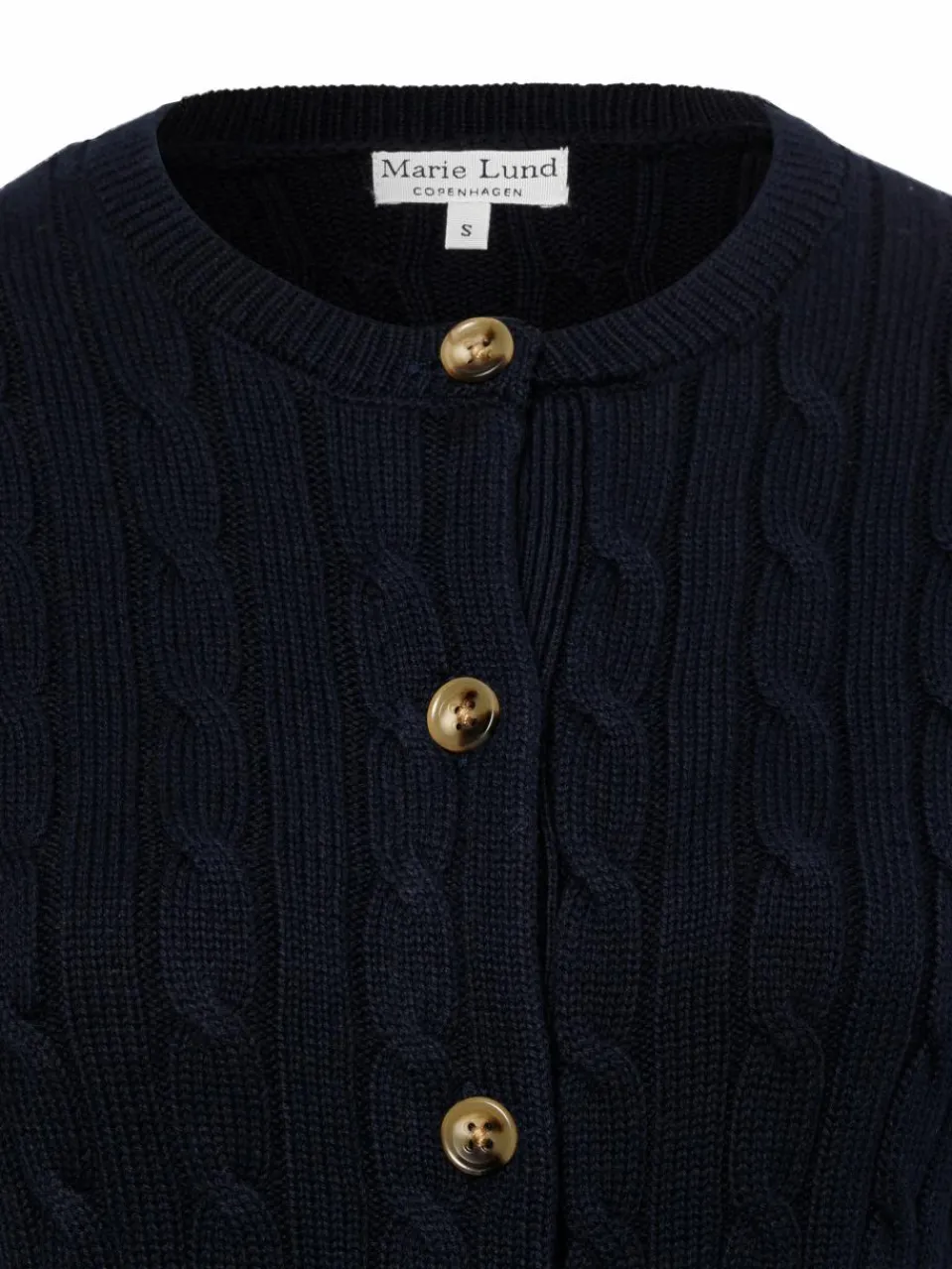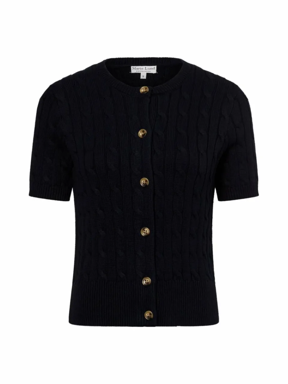 Diese stilvolle kurzärmelige Strickjacke von Marie Lund überzeugt mit einem groben Zopfstrickmuster, einem modernen Kurzarmdesign und einem markanten Verschluss mit großen Knöpfen – perfekt für einen lässigen, aber eleganten Look.