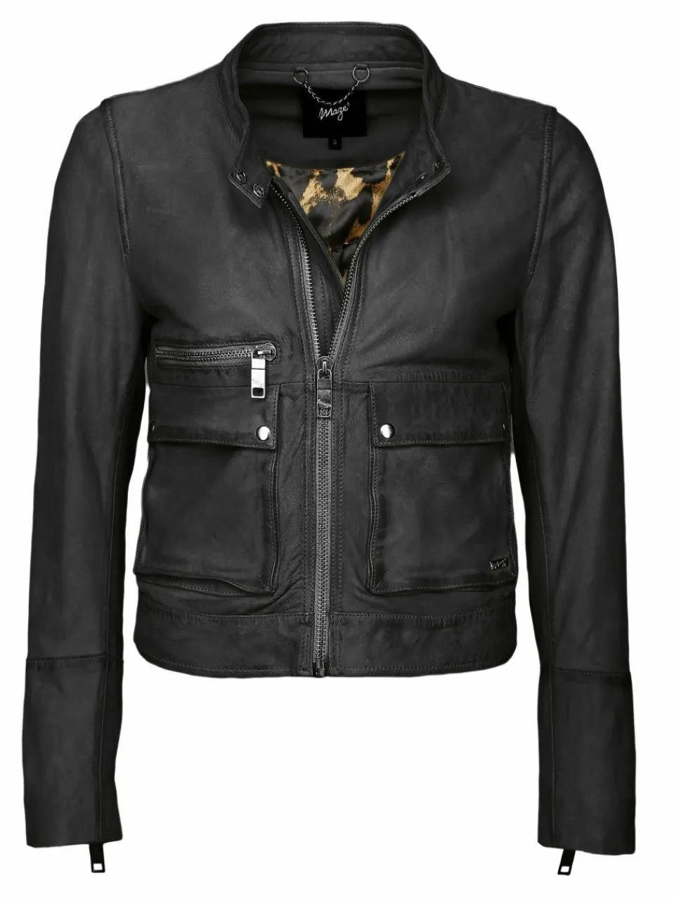 Sehr ausgefallene Lederjacke der Modemarke Maze. Sie bringt durch ihren taillierten Schnitt einen bequemen Tragekomfort mit sich. Sie wird über einen geraden Reißverschluss mit kurzem Stehkragen und Druckknöpfen geschlossen, besitzt drei Außentaschen – zwei davon mit Druckknöpfen & eine mit Zipper – und drei Innentaschen. Die Passform kann durch die Reißverschlüsse an den Ärmelabschlüssen angepasst werden. Das Innenfutter mit Leoprintmuster bringt Ihnen das gewisse Etwas. Ein absolutes