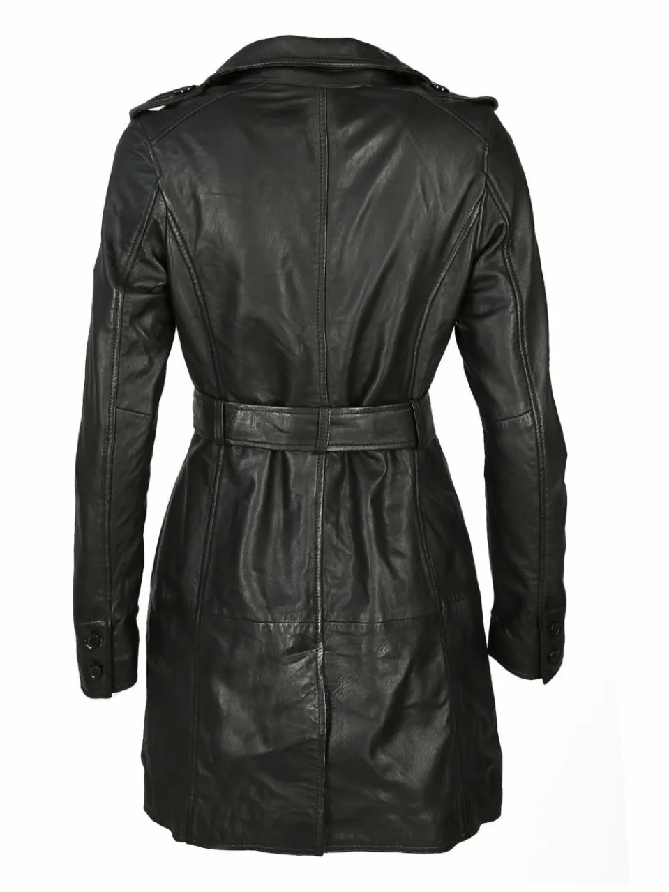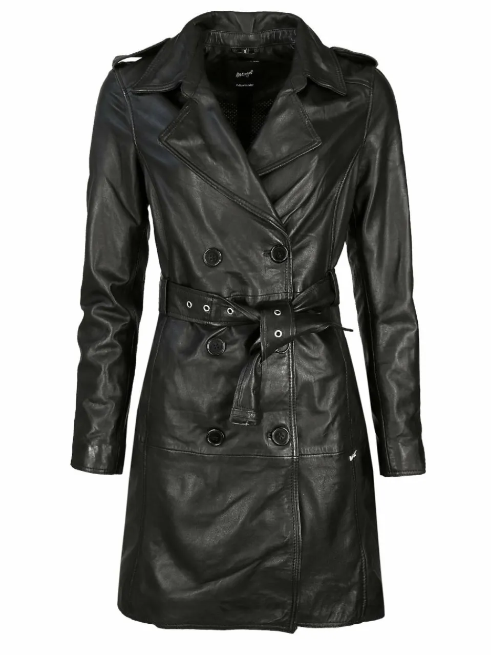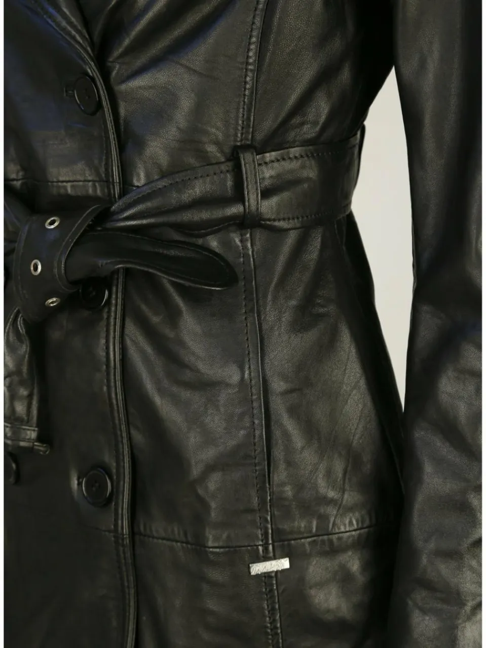Modische Lederlangjacke der Modemarke MAZE. Die Jacke verfügt über eine elegante Knopfleiste mit schön breitem Hüftgürtel. Durch den leicht taillierten Schnitt wird eine optimale Passform und ein hoher Tragekomfort garantiert. Der Tragekomfort kann durch die Knöpfe an den Ärmelenden angepasst werden. Die Jacke besitzt zudem einen schönen Innenfutter und einen weit geöffneten Hemdkragen.