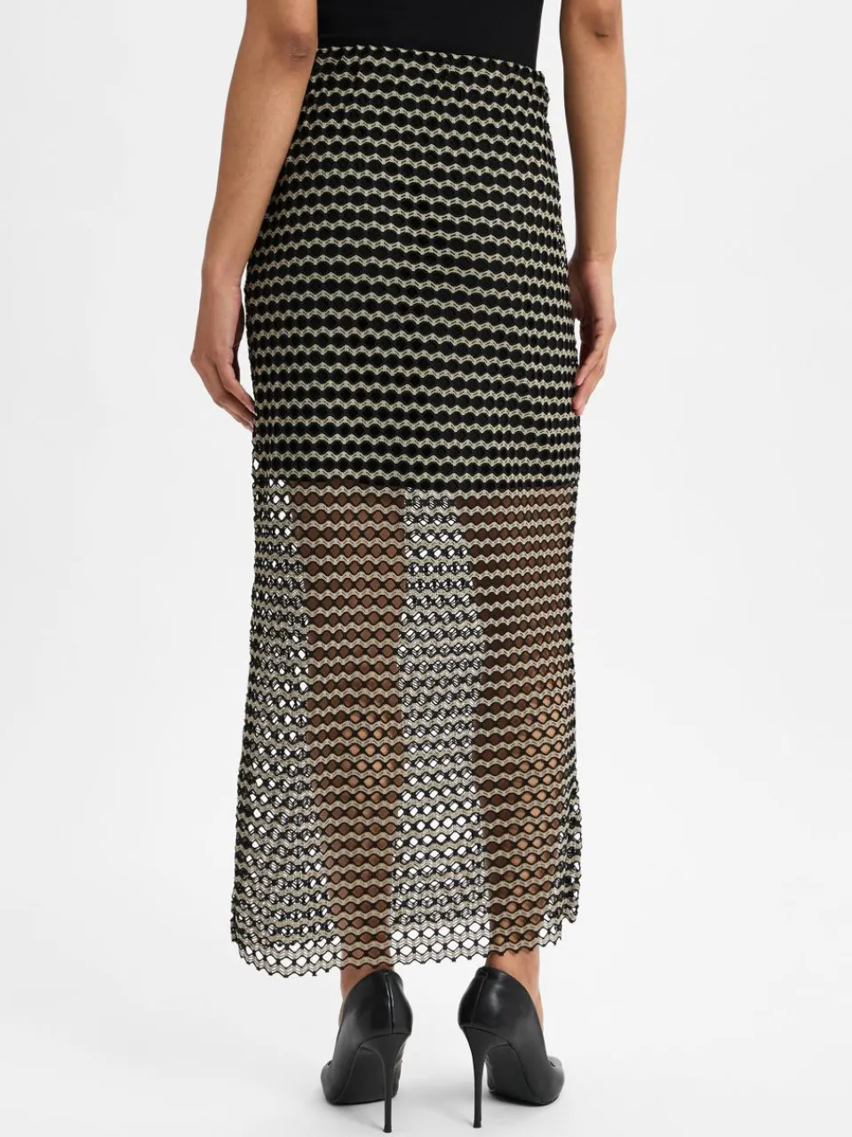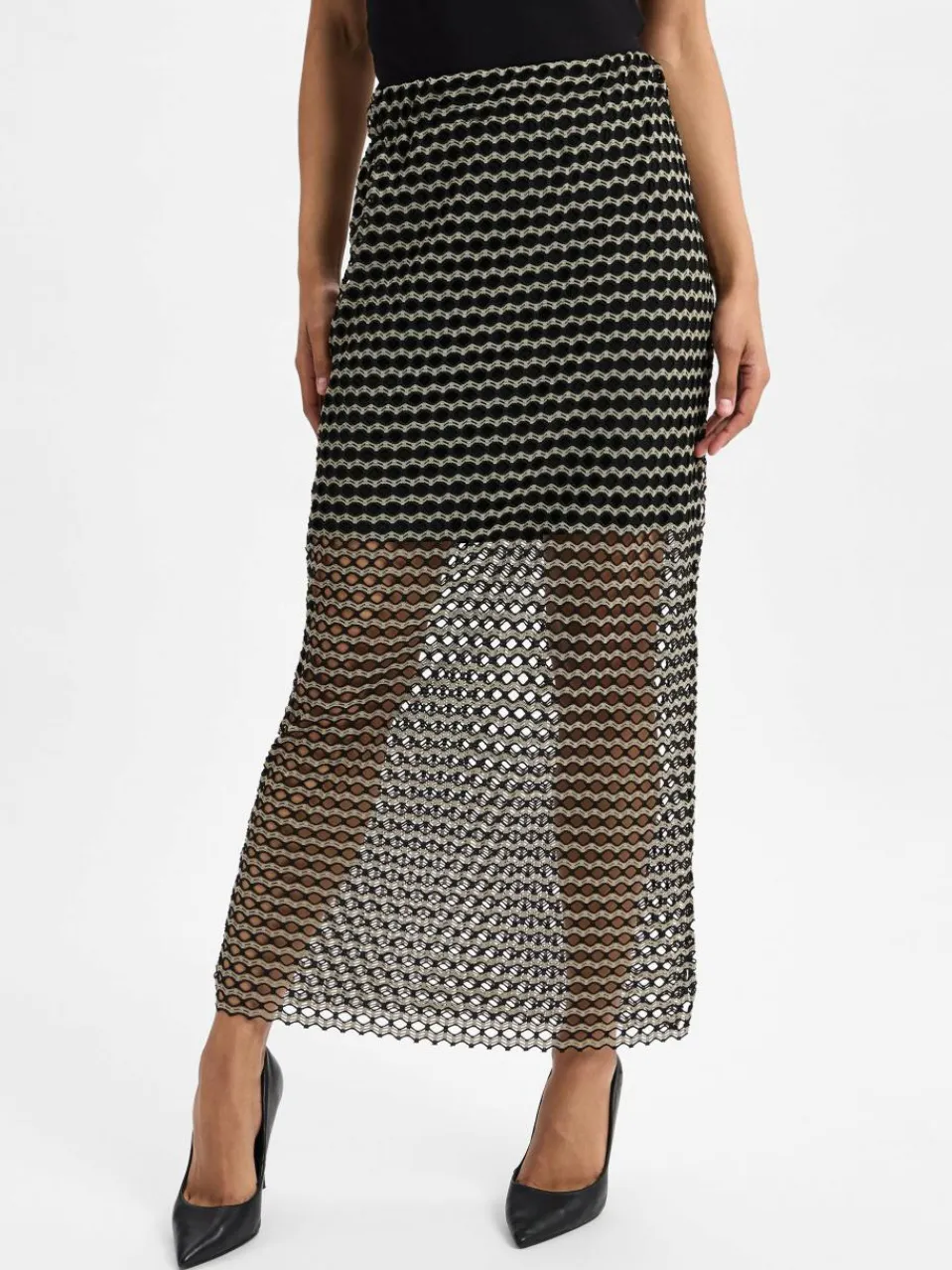 Der mbyM Jadine Maxirock mit Lochmuster in Kunstfaser-Qualität und elastischem Taillenbund sorgt für Tragekomfort und einen schicken Look.