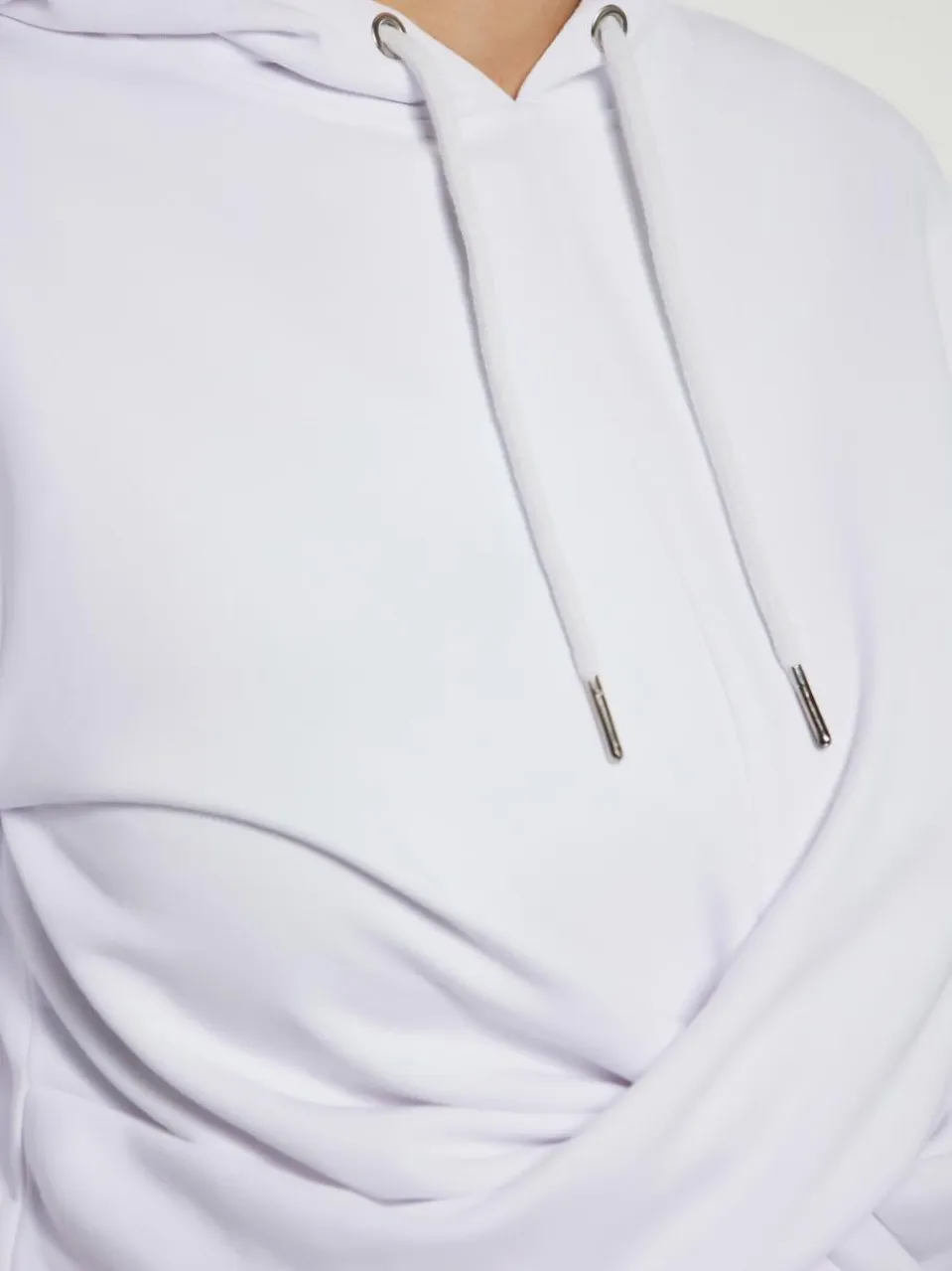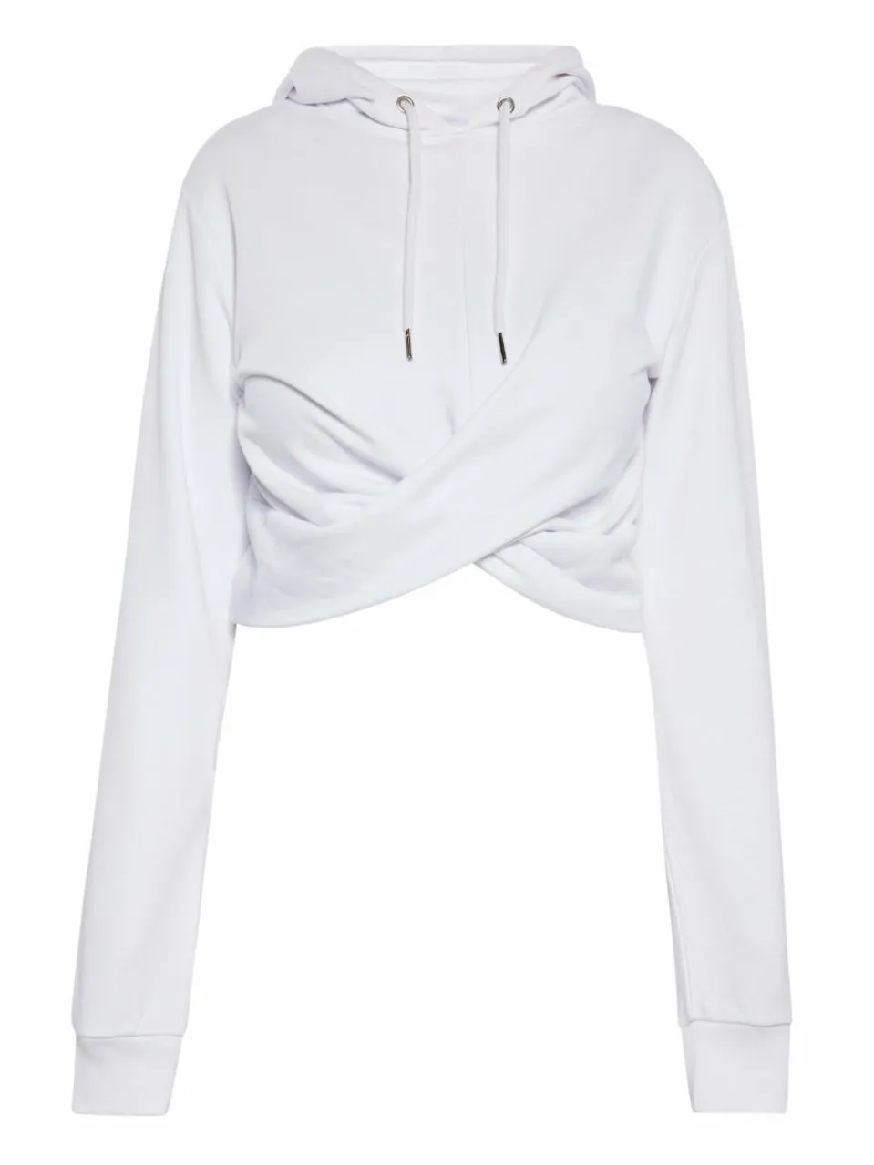 Discover the unique charm of this cropped hoodie with a twist. Featuring long sleeves with ribbed cuffs and a distinctive ribbed hem that’s shorter in the front and longer at the back, this hoodie exudes contemporary style. The standout element is the twisted design on the front, creating a textured, layered effect.