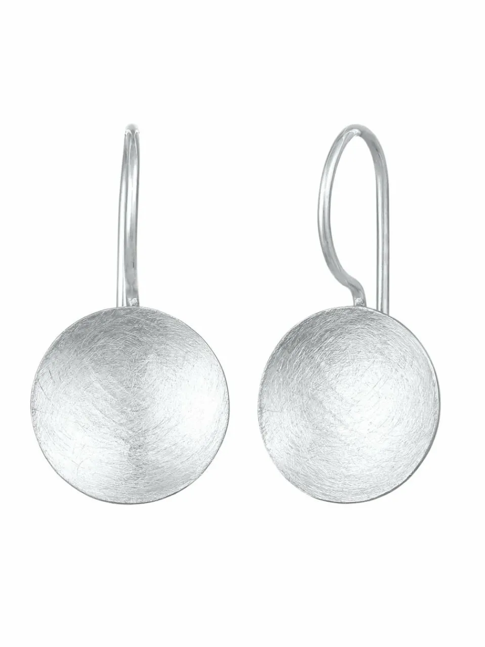 Modische Ohrhänger mit zeitloser runder Formgebung. Die Oberfläche der schlichten leicht gewölbten Plättchen ist kunstvoll gebürstet. Durch eine anschließende Neuversilberung, erhalten die Ohrringe eine besondere Brillanz. Eine gute Kombination zu jedem Outfit durch das schlicht moderne Design der Ohrhänger.