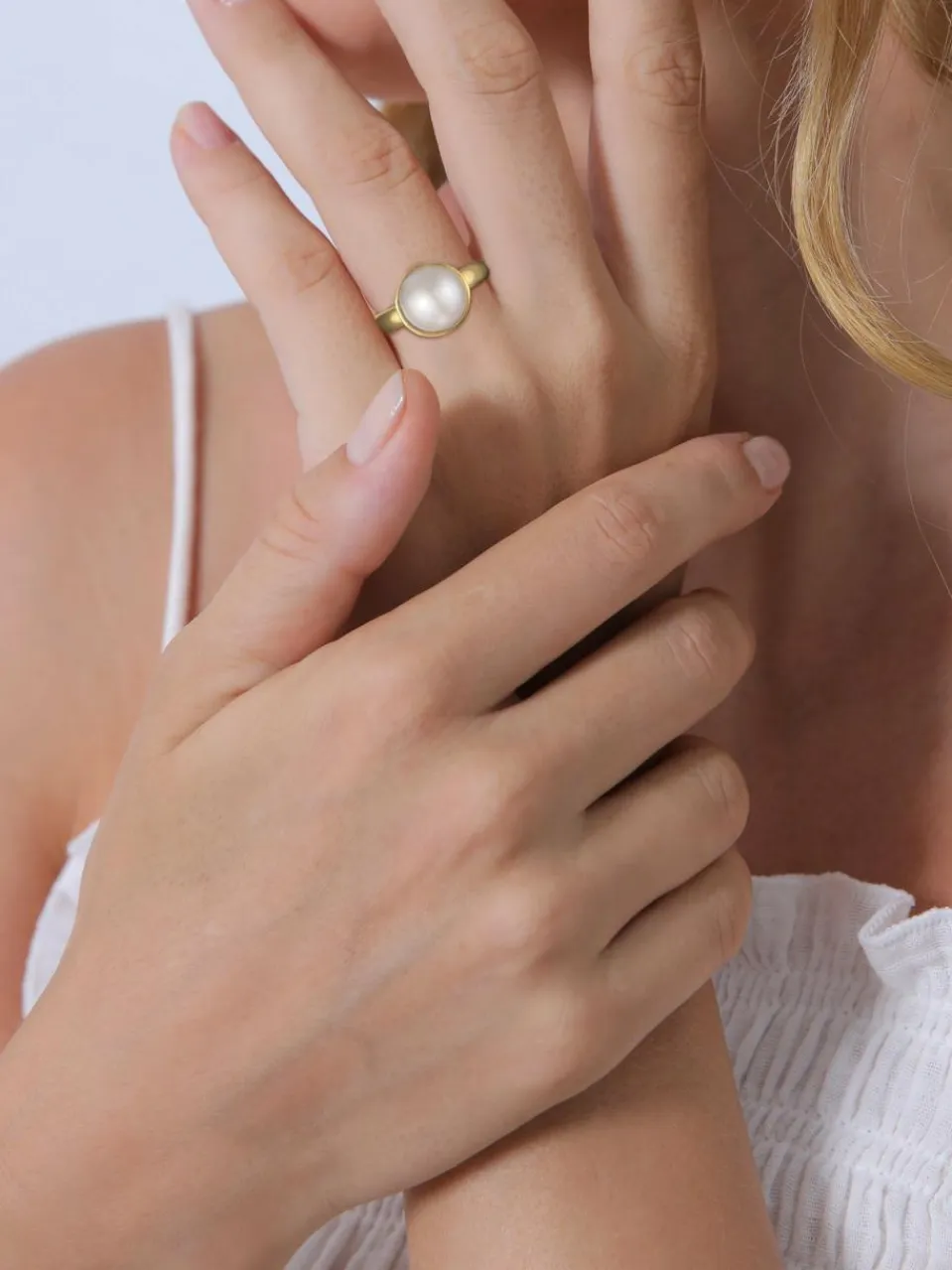 Ein auffallender Perlenring aus feinstem 925er Sterling Silber handgefertigt mittig mit einer halben Mabeperle schlicht gefasst. Dieser schnörkellose jedoch auffallende Perlenring verleiht seiner Trägerin eine ganz besondere romantische Ausstrahlung.