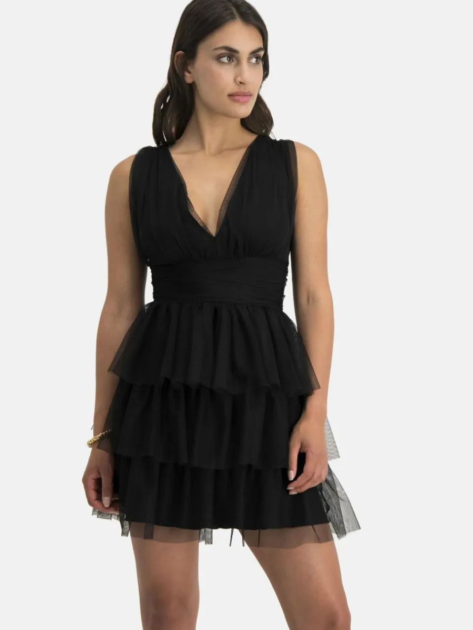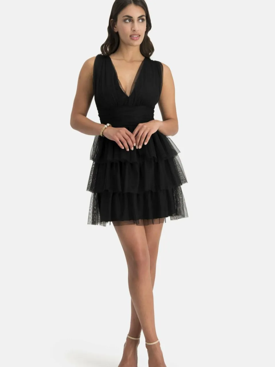 Das verspielte Tüllkleid von NICOWA lässt sie im Mittelpunkt stehen! Die feinen Lagen aus Tüll, auslaufend in einem gerüschten Stufenrock so wie der V-Ausschnitt sind dazu besonders feminin. Der Rockteil in Mini Länge ist mit Volants und einem Unterrock aus Ton-in-Ton-Jersey versehen. Die Italienische Verarbeitung setzt Ihre Figur wunderbar in Szene! Das Model ist 1,78 cm und trägt Größe 34.