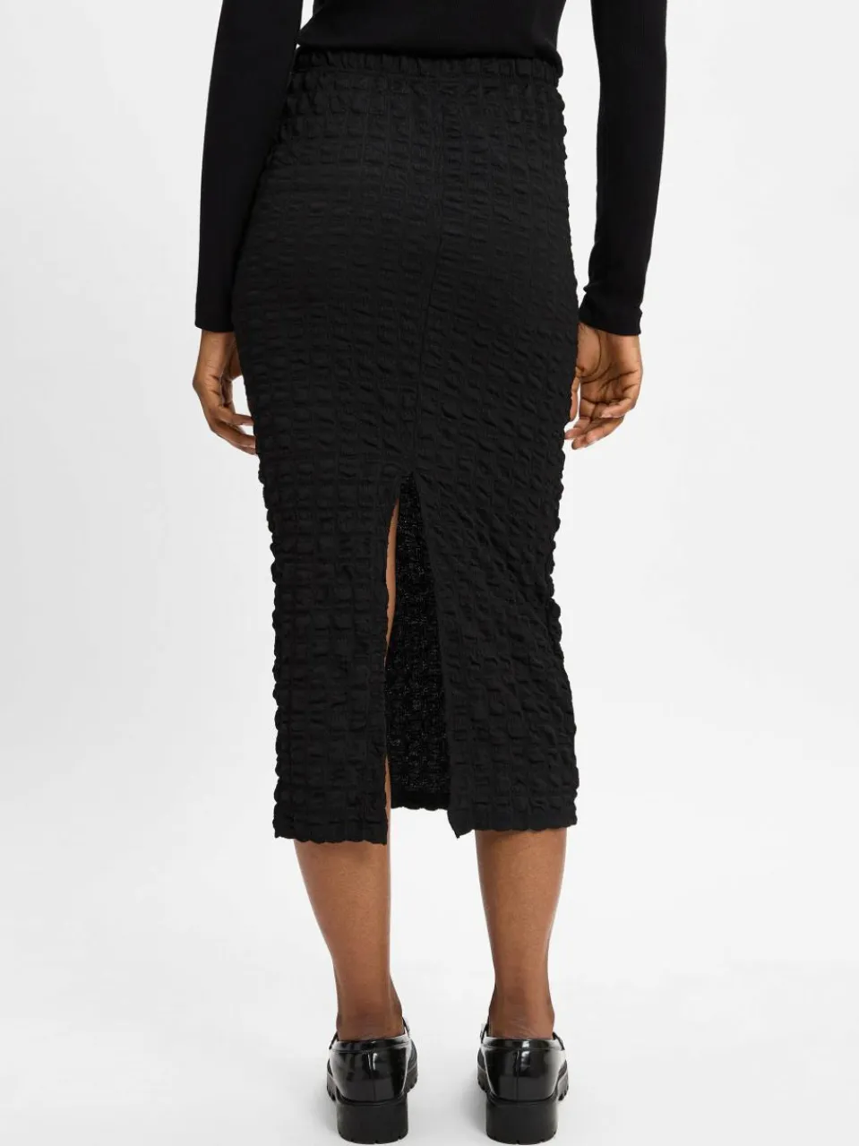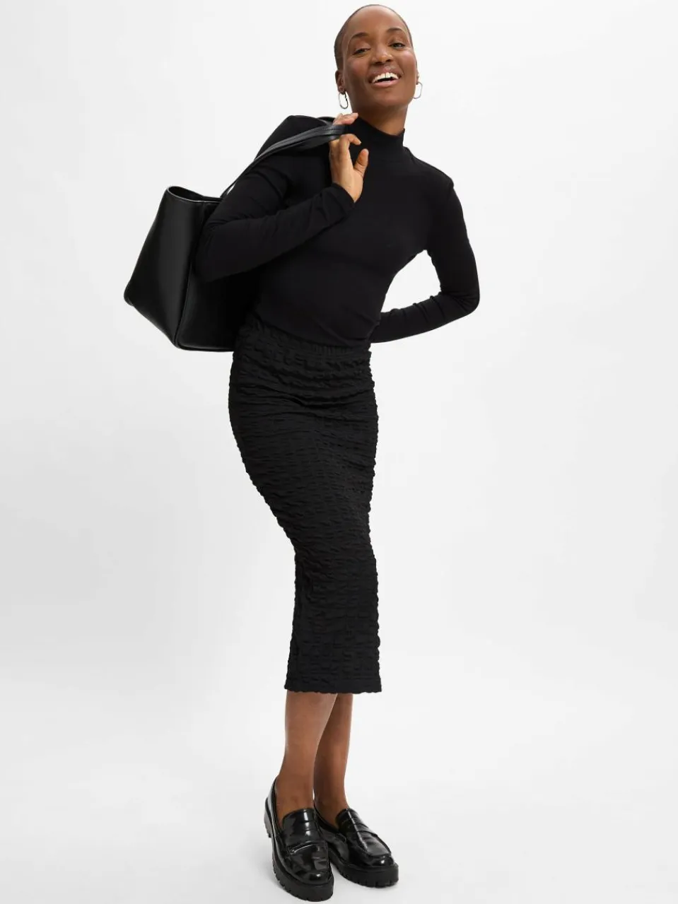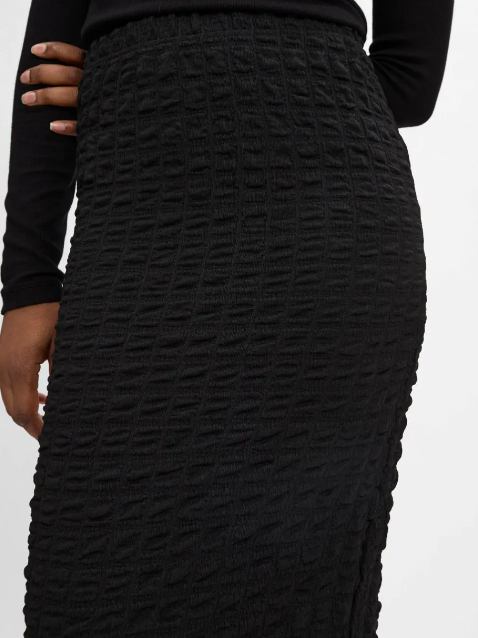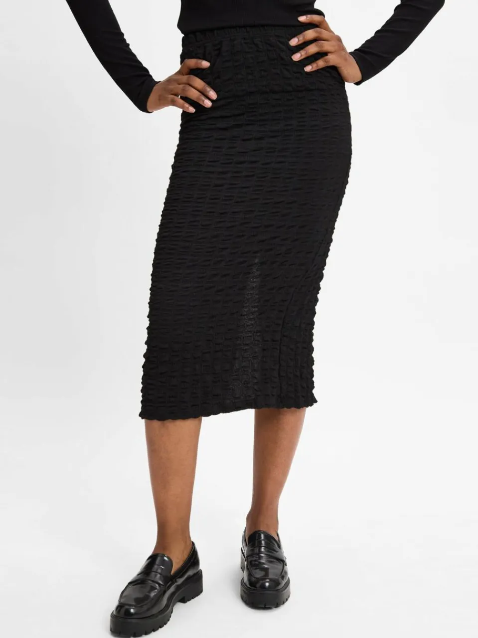Dank Crinkle-Optik, langer Pencil-Skirt-Silhouette und Beinschlitz entwickelt sich der Rock NMZahara von Noisy May im Nu zum Lieblingsstyling-Piece.