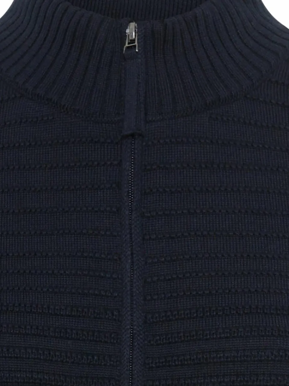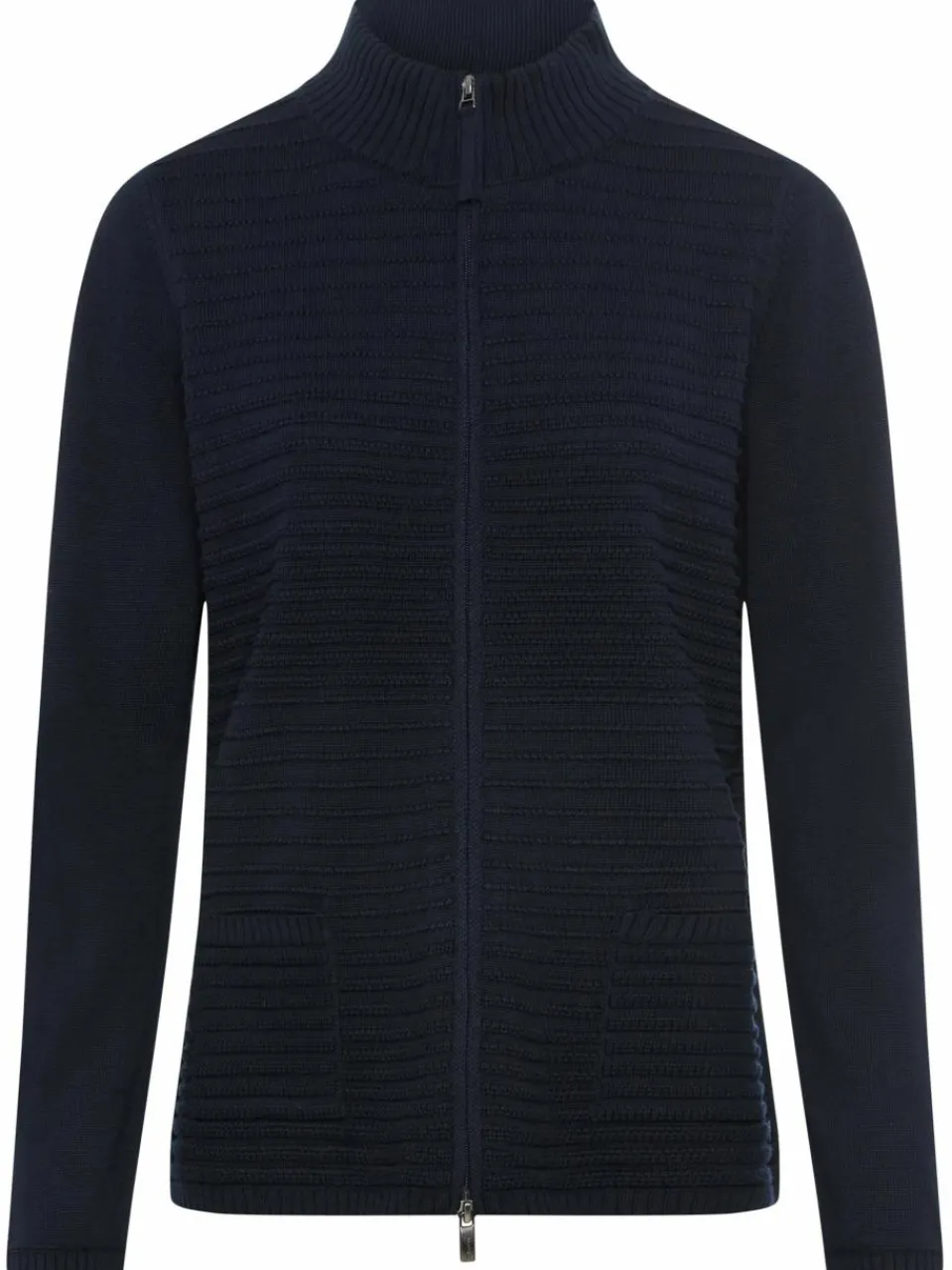 Die Strickjacke Eva von Olsen mit haptischer Rippstruktur an der Vorderseite und praktischem Two-Way-Zipper verleiht dem Look nonchalant eine casual-sportive Note.