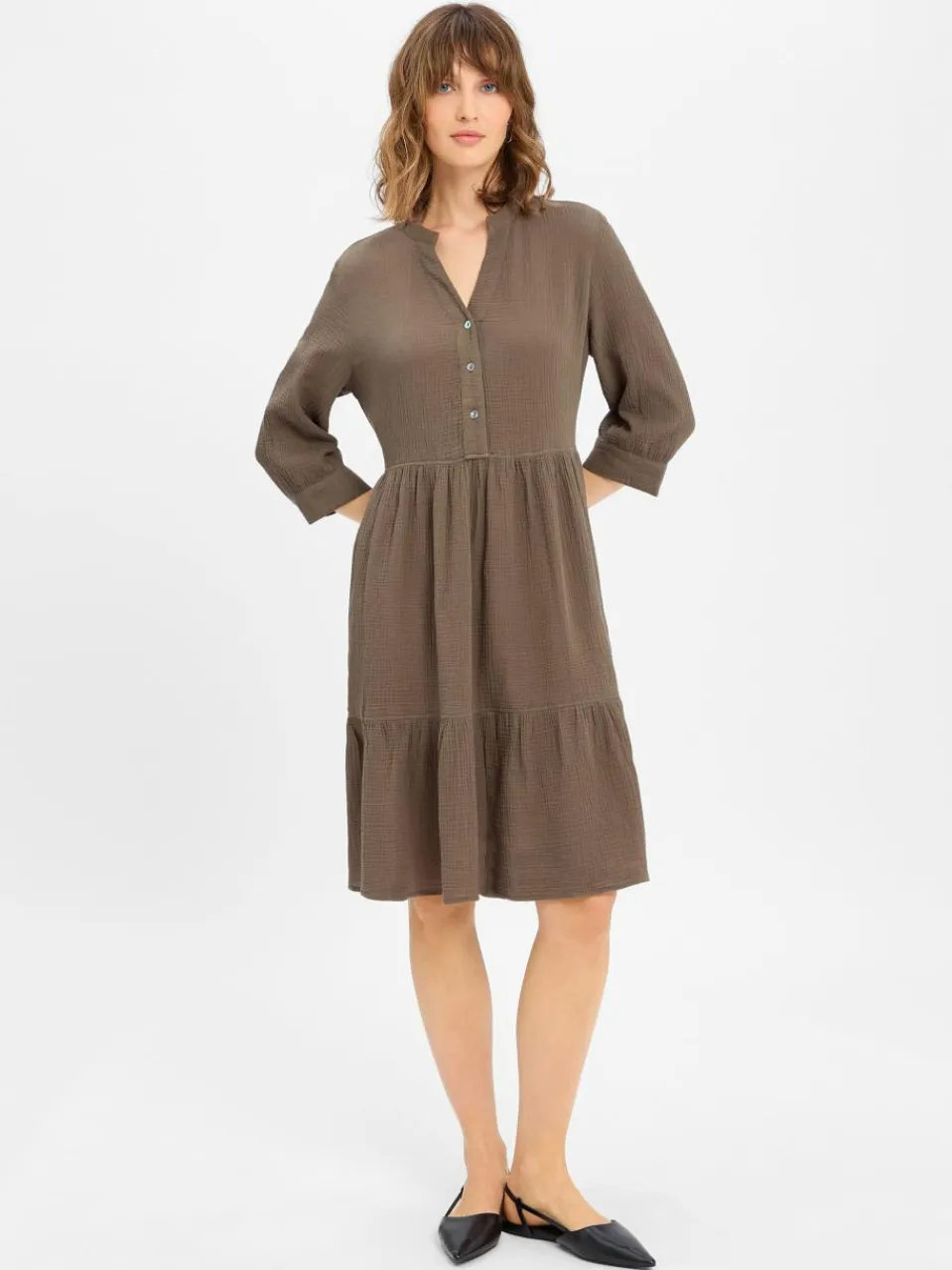 Das Dress Wolka von Opus setzt mit relaxter Passform, weicher Baumwolle und Details wie den 3/4-Ärmeln, Raffungen und Volantsaum auf Tragekomfort und bietet gleichzeitig viele Styling-Möglichkeiten.