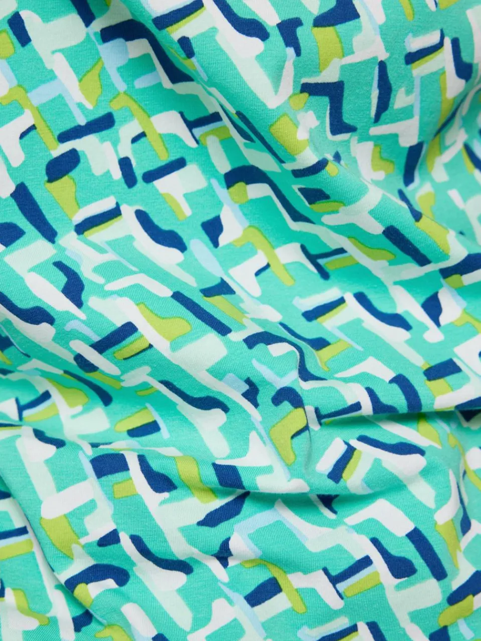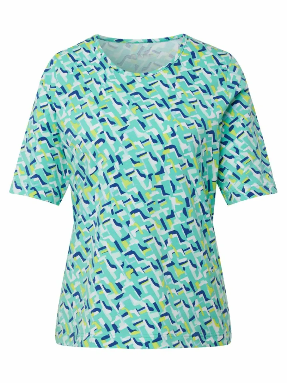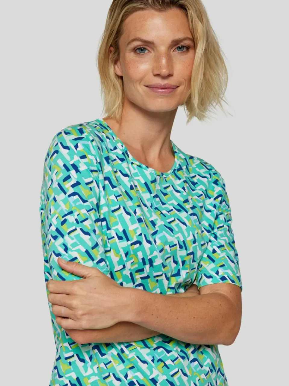 Dieses Shirt kombiniert ein kreatives, abstraktes Muster mit maximalem Tragekomfort und sorgt so für einen einzigartigen Look in Ihrer Garderobe.Abstraktes Allover-Design – Lebendige Farbkombination in Blau, Grün und Weiß für einen dynamischen Stil.Bequemer Schnitt – Figurbetont und angenehm, ideal für den Alltag.3/4-Ärmel – Praktisch und vielseitig für die Übergangszeit.Vielseitig kombinierbar.